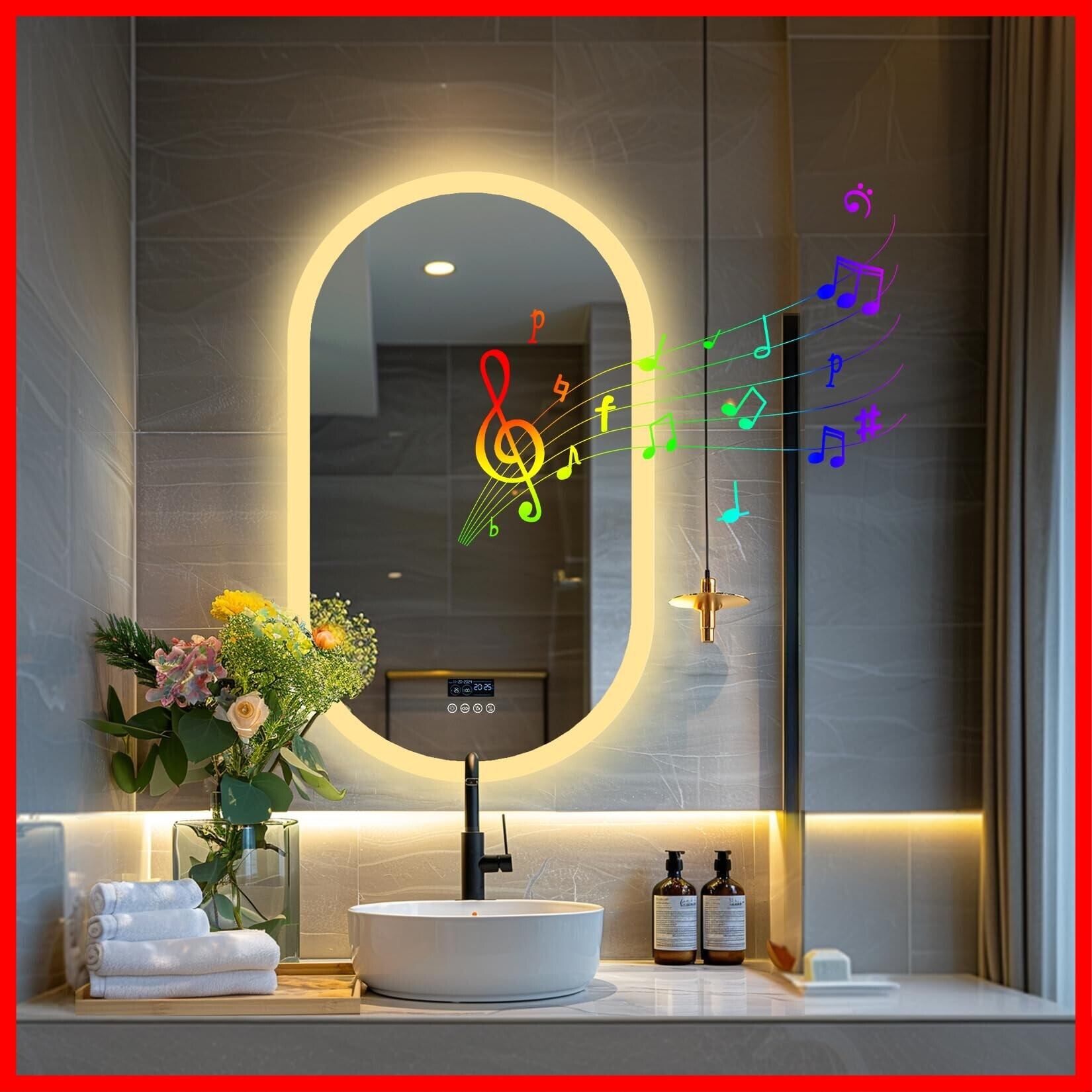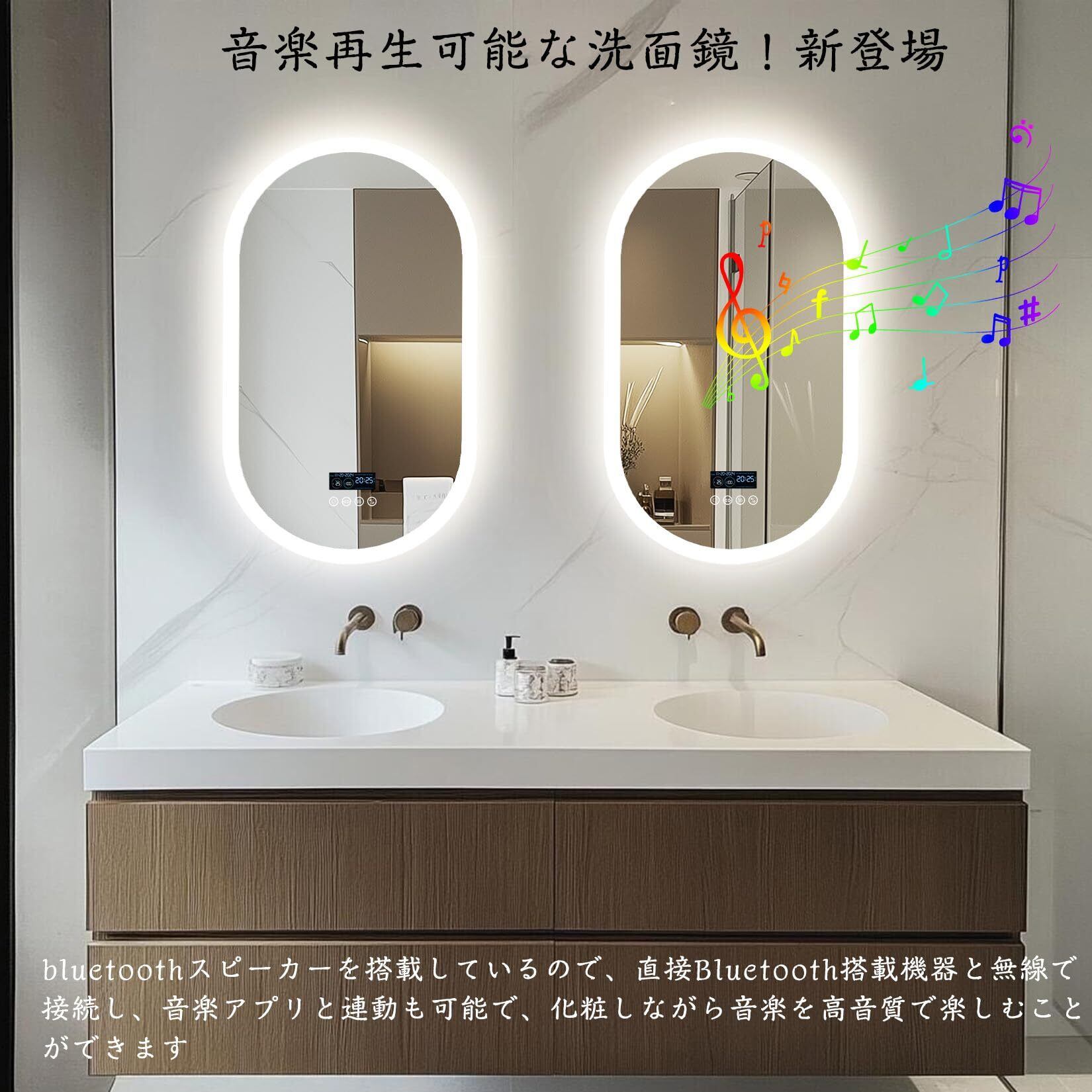 【音楽再生可能な洗面鏡!新登場】高音質なスピーカーを搭載している洗面鏡で、直接スマホなどと無線で接続し、音楽アプリと連動も可能で、化粧しながら音楽を高音質で楽しむことができます。家にも美容室・ヘアサロンにも大幅に応用できます