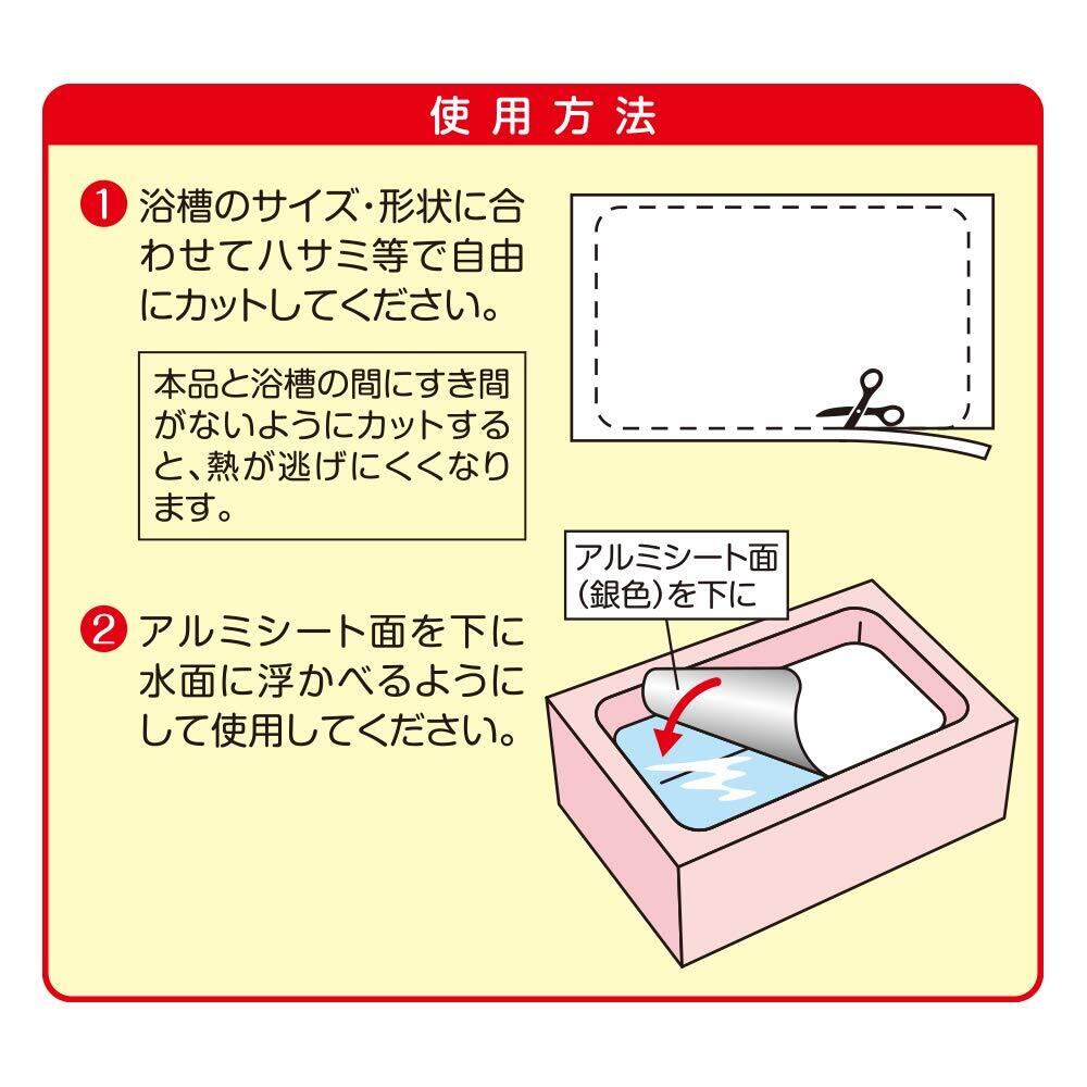 【使用方法】①浴槽のサイズ・形状に合わせてハサミ等で自由にカットしてください。※本品と浴槽の間にすき間がないようにカットすると、熱が逃げにくくなります。②アルミシート面を下に水面に浮かべるようにして使用してください。