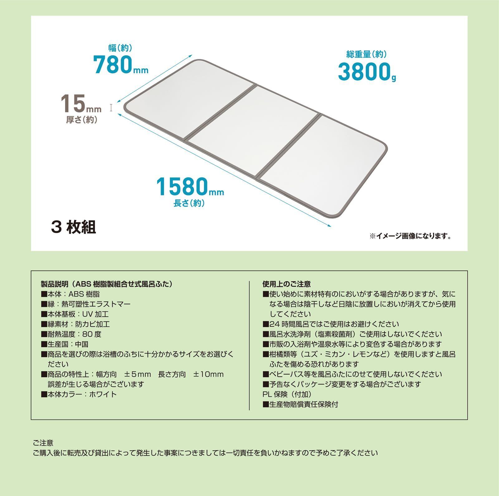 色:ホワイト | サイズ:78×158cm 組数(3枚組)■使い始めに素材特有のにおいがする場合がありますが、気になる場合は陰干しなど日陰に放置しにおいが消えてからご使用ください ■風呂ふたを洗う時には中性の浴槽洗剤をご使用ください■汚れ落としに塗料用のシンナー、塩素系の洗剤、漂白剤、カビ取り剤、および歯磨き粉、固いたわし等は、風呂ふたを傷めますので絶対にし使用しないでください■いつも濡れたままの状態ではカビが発生しやすくなります。ときどき陰干しをしてください■一部の入浴剤や温泉水等により変色する場合がありますのでご注意ください■風呂水洗浄剤(塩素殺菌等)、浴室用洗剤(アルカリ性等)によって風呂ふたが傷んだり、変色、劣化しますので使用しないでください■塩素系殺菌、浴槽水浄化保温装置(24時間風呂)にご使用されますと風呂ふた表面の荒れ、退色などの変化を生じるおそれがありますので、ご使用をお避けください■風呂ふたの上にベビーバスなどを乗せて使用するのは大変危険です絶対にやめましょう