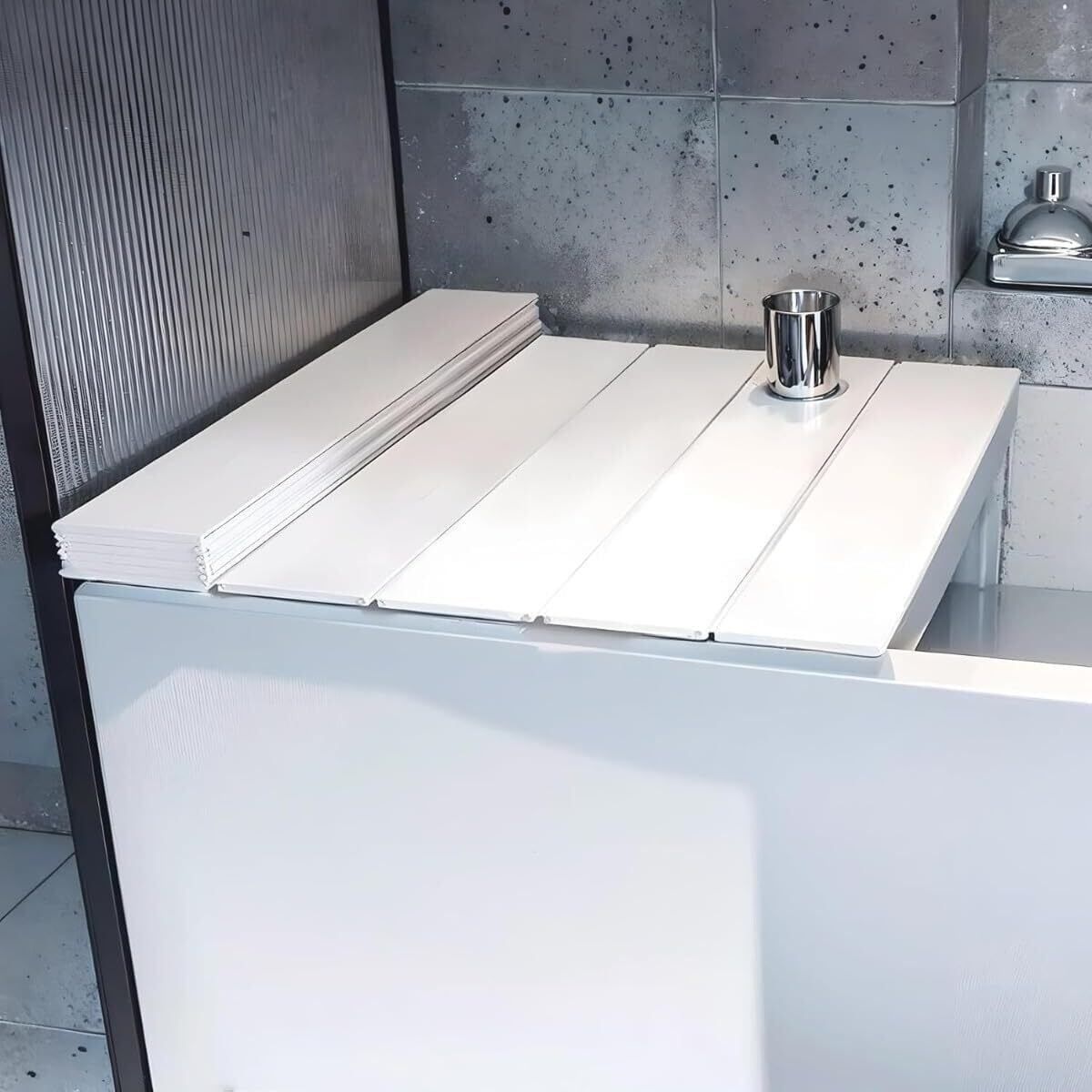 多機能バスタブふた:お風呂時に保温する、使わない時に清潔に保ち、ほこり防止。バスタブの空間を活用して、一部折りた置物棚として浴室用品を収納することもできる。