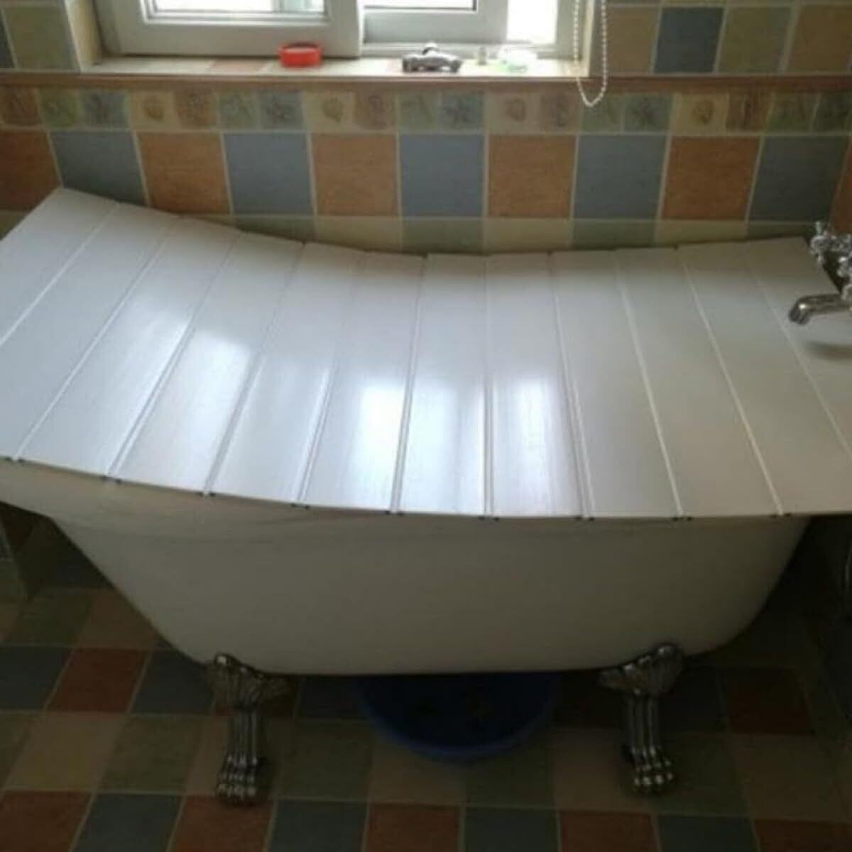 【多機能バスタブふた】お風呂時に保温する、使わない時に清潔に保ち、ほこり防止。バスタブの空間を活用して、一部折りた置物棚として浴室用品を収納することもできる。