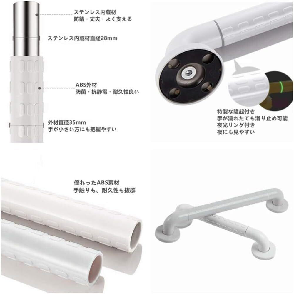 ②優れった素材:浴槽手すり表面は高品質のABSプラスチックを利用し、錆つき無し・良い耐久性・静電気無し・冬にも常温保ちなどの特性に優れったアイテムです。ステンレスの内装材を利用し、主な重力を耐えます。