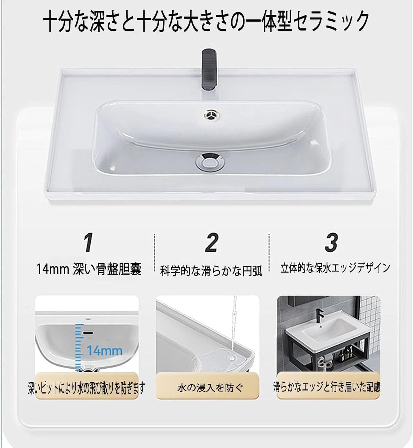 【十分な収納スペース】ユニークな幅広のメインキャビネット収納設計により、小さな洗面台に驚くほど大きなスペースが確保され、アイテムを整然と配置できるため、洗面エリアの全体的な実用性が向上します。