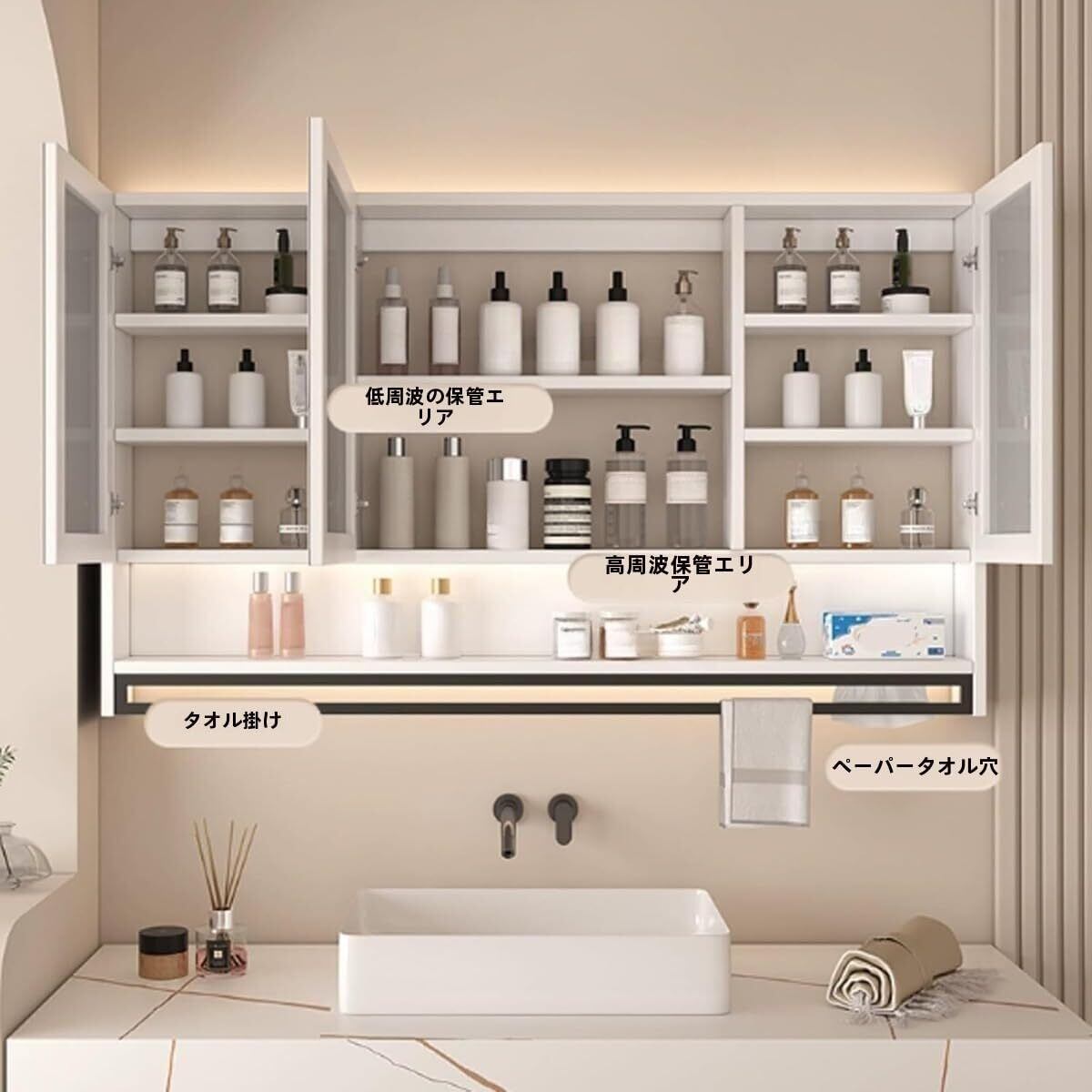 十分な収納スペース:このバスルームの鏡キャビネットには独立した収納スペースがあり、区画で使用でき、バスルームの必需品を整理するための十分なスペースを提供し、整頓して取り出しやすくします。