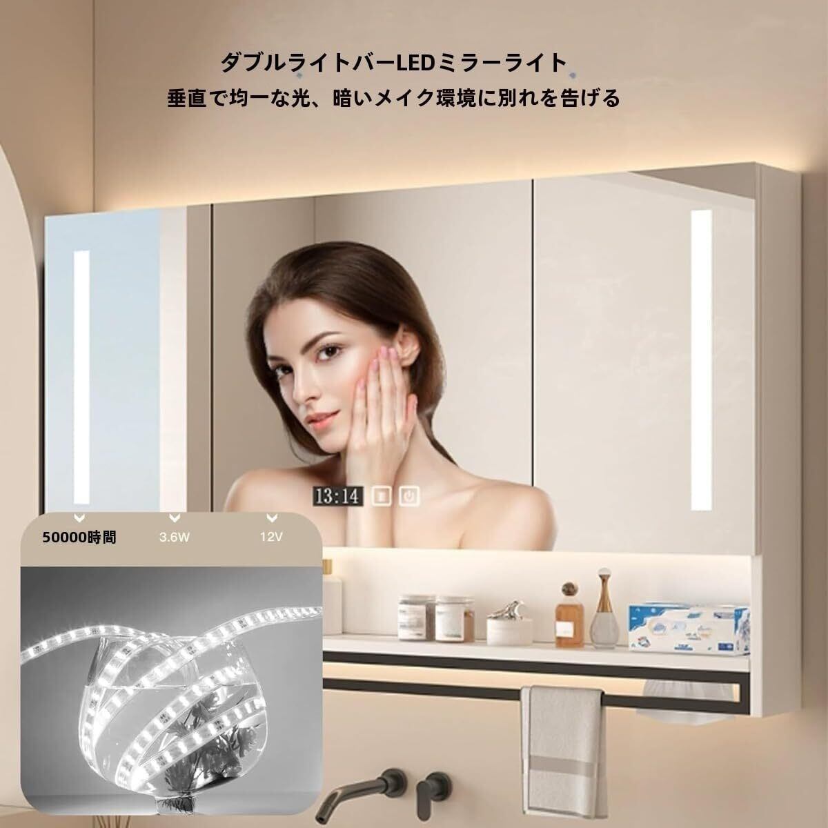 製品名: 無垢材のスマートバスルームミラーキャビネット壁掛け、バックライト付き防曇バスルームミラー収納ラック、個別に収納可能。