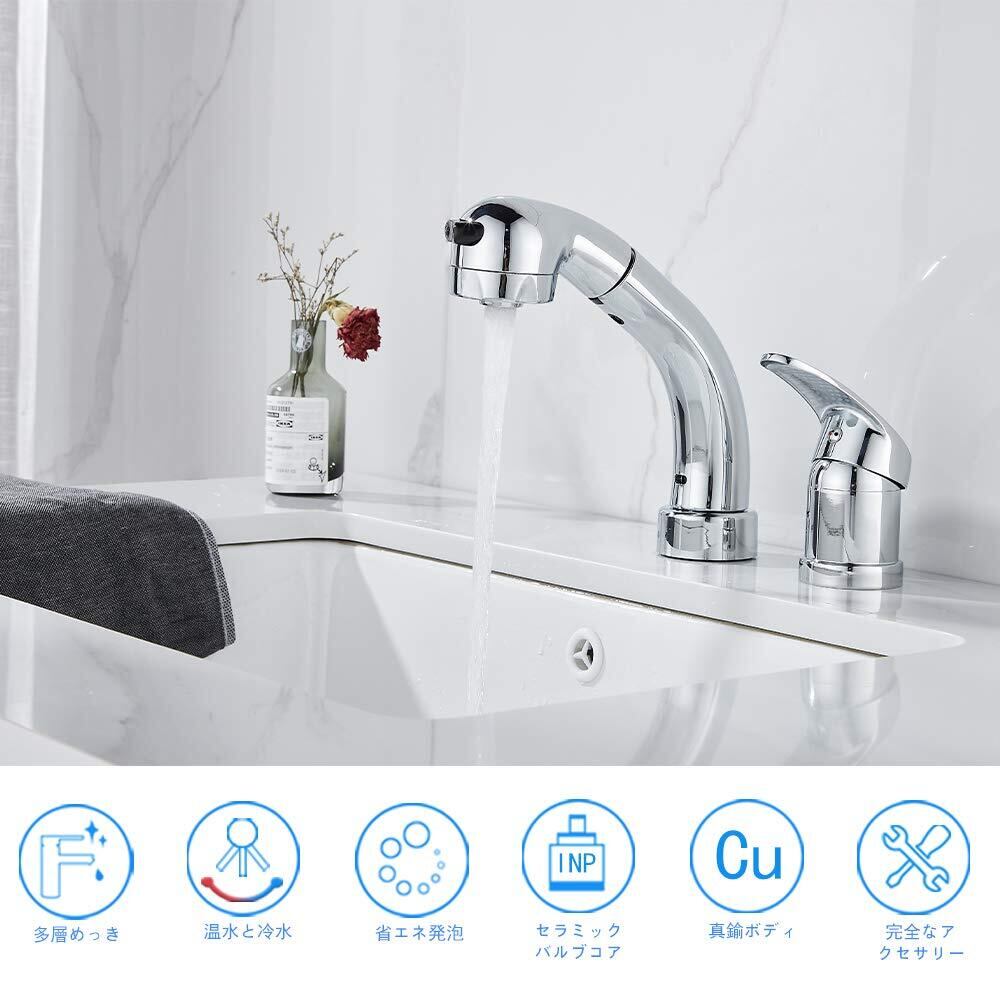 Maynosi 洗面台蛇口 洗面水栓 ツーホール式 洗髪用 シングルレバー混合栓 2穴台付き ホース引き出し式 2つの水流モード 360°回転 吐水口昇降 取り付けホース付き 真鍮 研磨