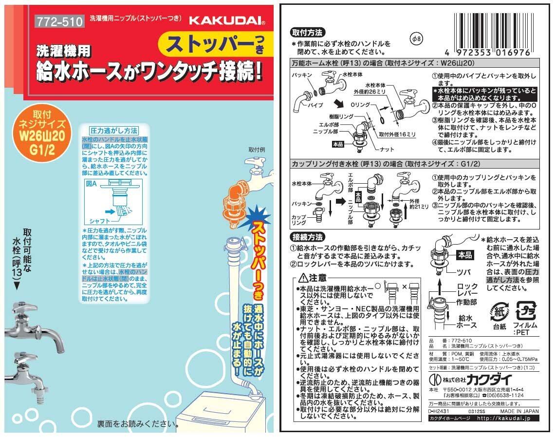 カクダイ 洗濯機用 水漏れ防止ストッパー付きニップル 2サイズ兼用 取付簡単 樹脂製 772-510