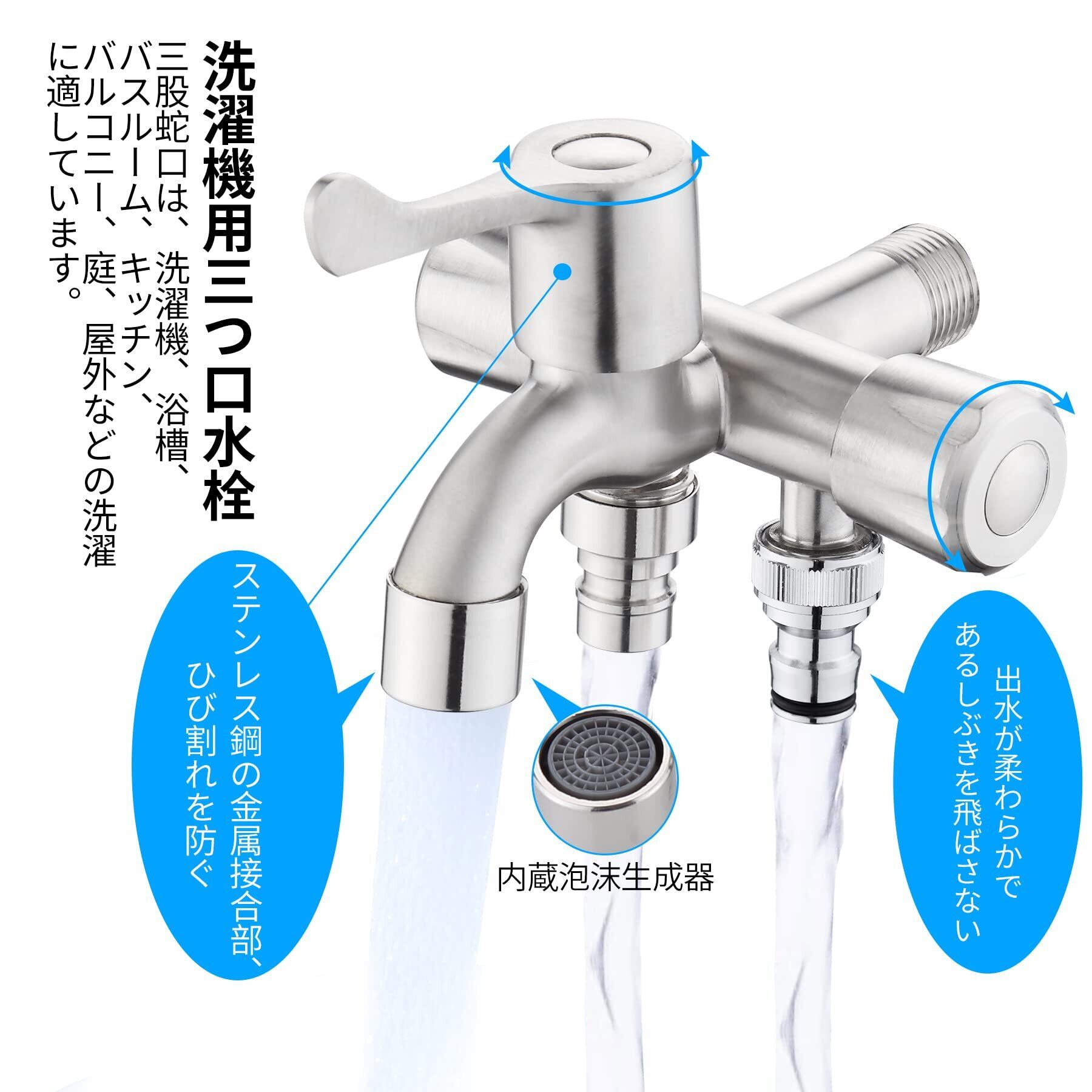 【漏水防止&独立したハンドル】蛇口出口にはフィルターを採用し、水流を柔らかくするとともに、蛇口の水漏れを効果的に防ぎます。独立したハンドルなので一方を洗濯機、もう一方を散水などの給水ホースに利用できます。