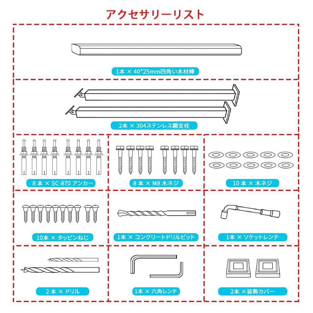 【手すりコンプリートキット】-1本 × 40*25mm四角い木材棒,2本 × 304ステンレス鋼支柱,8本 × SC-870 アンカー ,8本 × 木ネジ,10本 × 平ワッシャー ,10本 × タッピンねじ,2本 × 六角レンチ,1本 × コンクリートドリルビット ,2本 ×木工ドリルヘッド,1本 ×ソケットレンチ,2本 ×装飾カバー,1本 ×取り付け説明書。