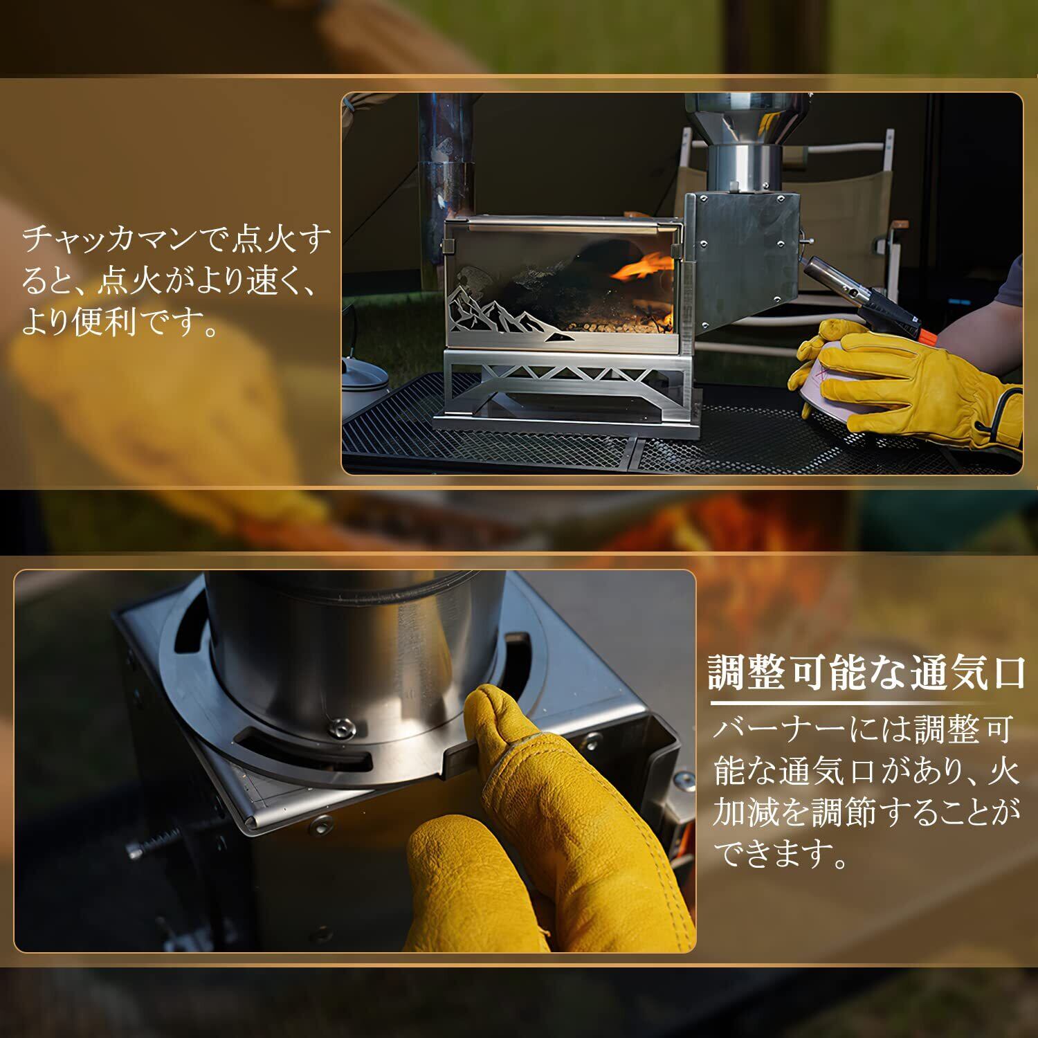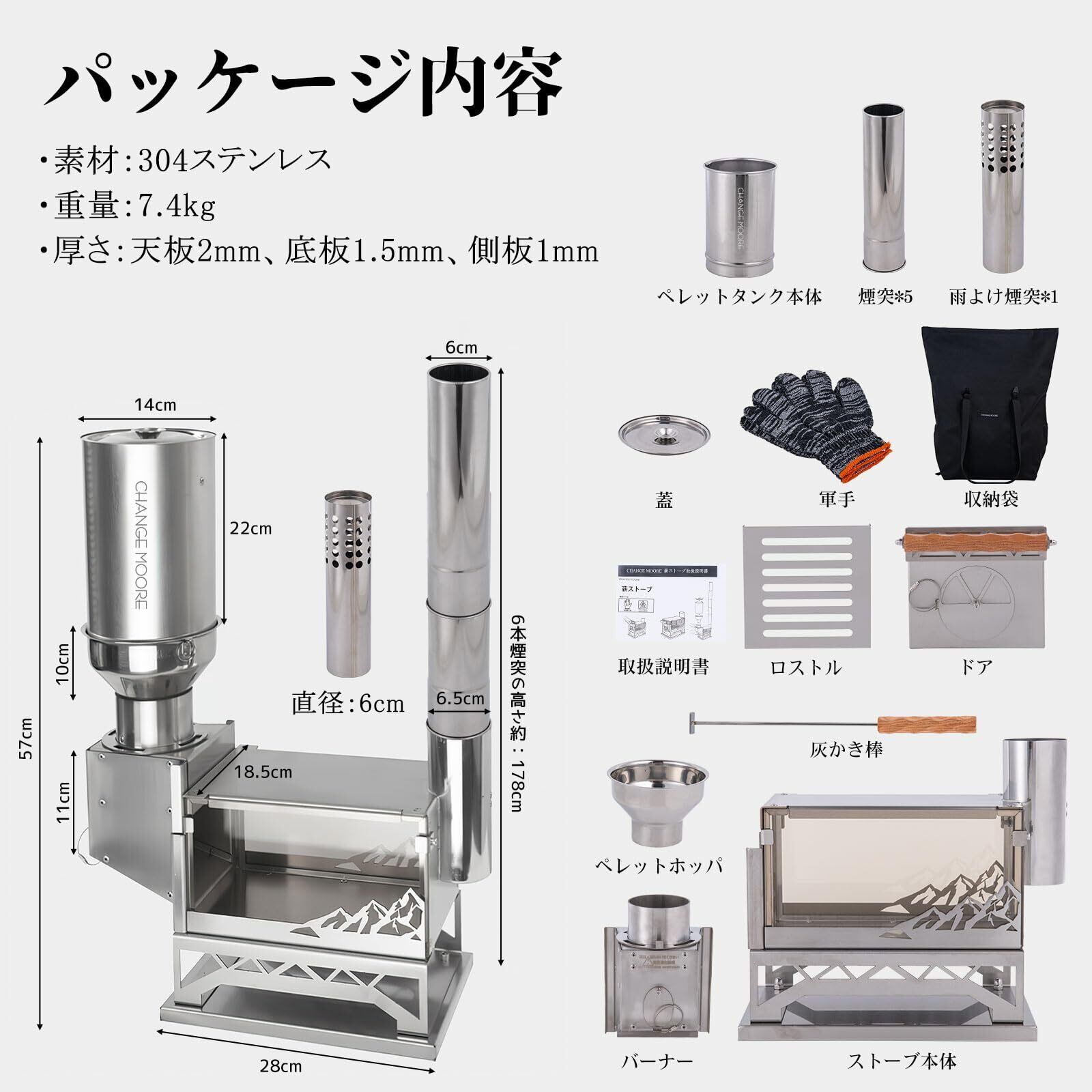 【サイズ&素材】素材:304ステンレス+最高900℃まで耐熱ガラス。厚さ:天板2mm、底板1.5mm、側板1mm。「ストーブの組立サイズ」:奥行28cmx幅18.5cmx高さ142cm(煙突を含む)。「タンクの組立サイズ」:約14cmx15cmx高さ48cm。「組合せの重量」:7.5kg。ストーブはステンレスを使用、錆びに強く腐食しにくい耐久性抜群。登山やツーリングなどでは携帯しやすい小型のストーブです。 【セット内容:】ストーブ本体+ドア+煙突*6(スパークアレスターを含む)+灰かき棒+ロストル+ペレットタンク本体+ペレットホッパ+バーナー+蓋+収納袋+軍手+日本語取扱説明書