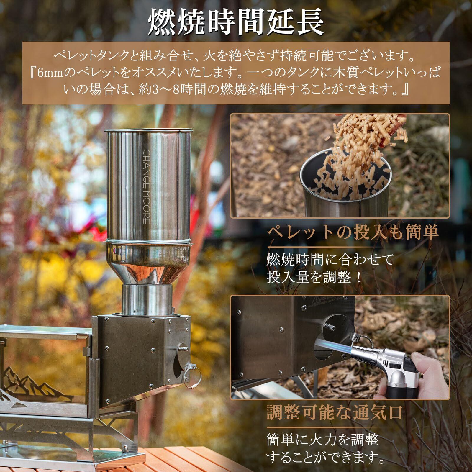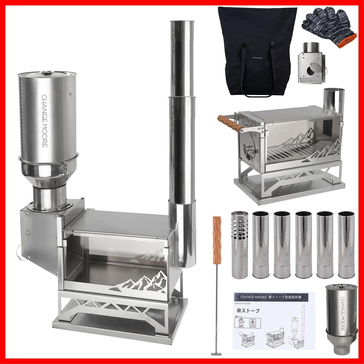 【在庫処分】CHANGE MOORE ペレットストーブ 薪ストーブ ペレットタンク ミニ卓上薪ストーブ【日本語説明書付属】 火を絶やさず持続可能 耐高温ガラス窓 スパークアレスター煙突付き 天板厚手2mm 304ステンレス ストーブ 薪暖炉 テント用 焚火台 観賞性 調理 暖炉 家庭 キャンプ用 アウトドア 収納袋付き | Cherry Blossoms