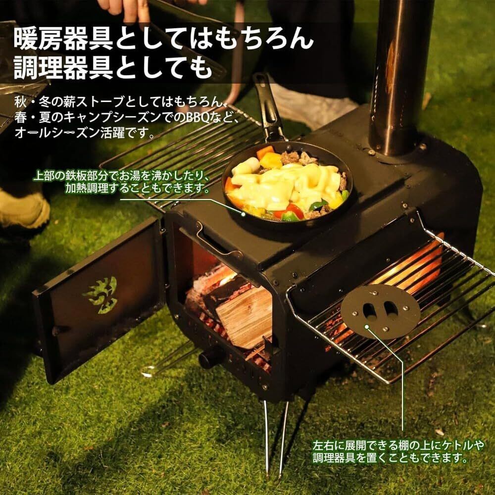 【多機能・持ち運びやすい】煙突も本体も取り外し可能で、フラットでコンパクトに収納できます。収納袋も付いており、持ち運びにとても便利です。テントストーブは調理器具としてだけでなく、グリルやオーブンとしても使えます。