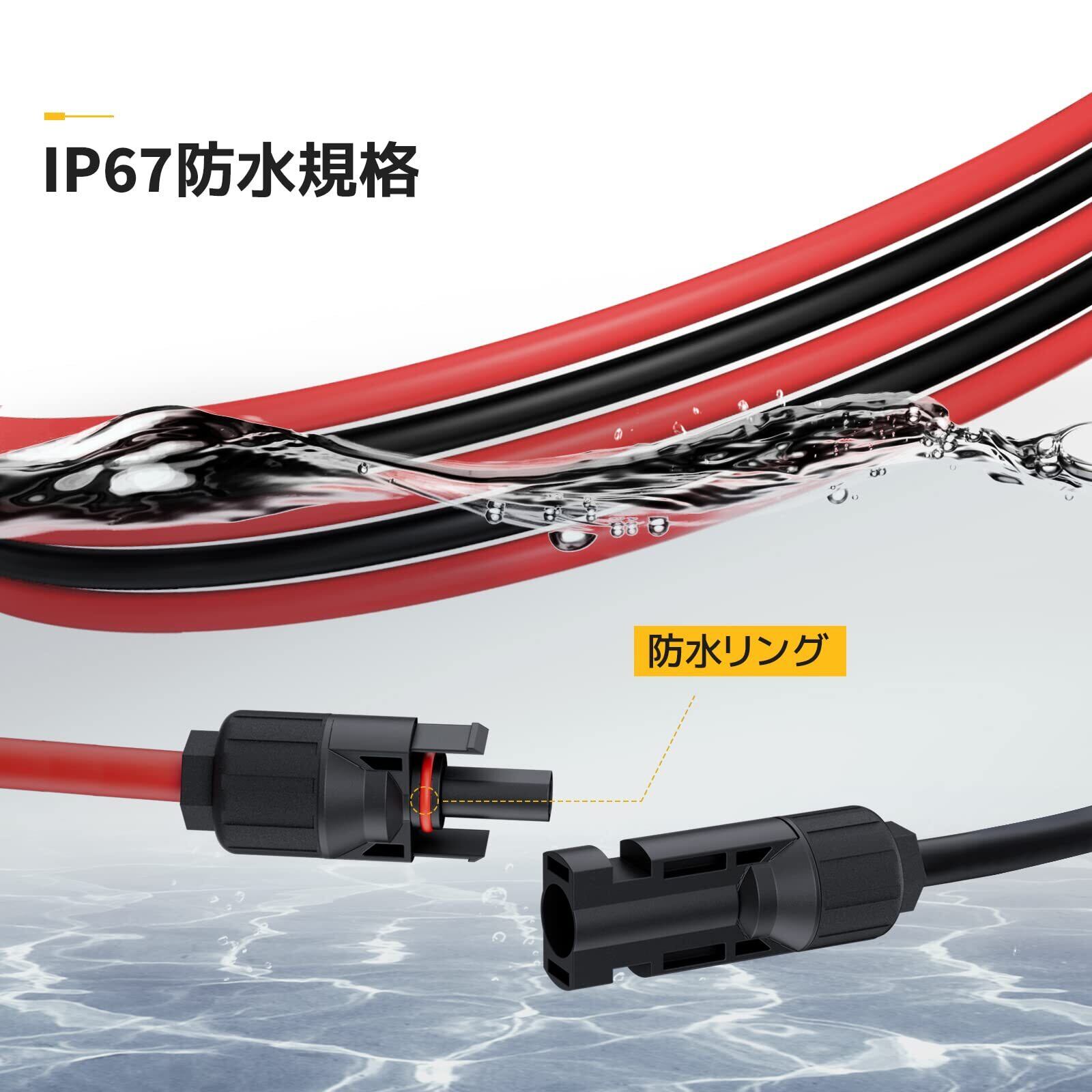 【耐久性&防水性】BougeRVの太陽光パネル延長ケーブルのカバーには二重のPVC材料が用いられており、従 来のソーラーケーブルより耐衝撃性とUV保護の特性がアップされます。また、内部に防水リングを加え、防水レベル はIP67に達し、水や粉塵の侵入を防ぎ、耐用年数は20年以上に達します。更に、ある程度の硬さがあり、屋外 でも長期使用でき、頻繁交換の手間が省けます