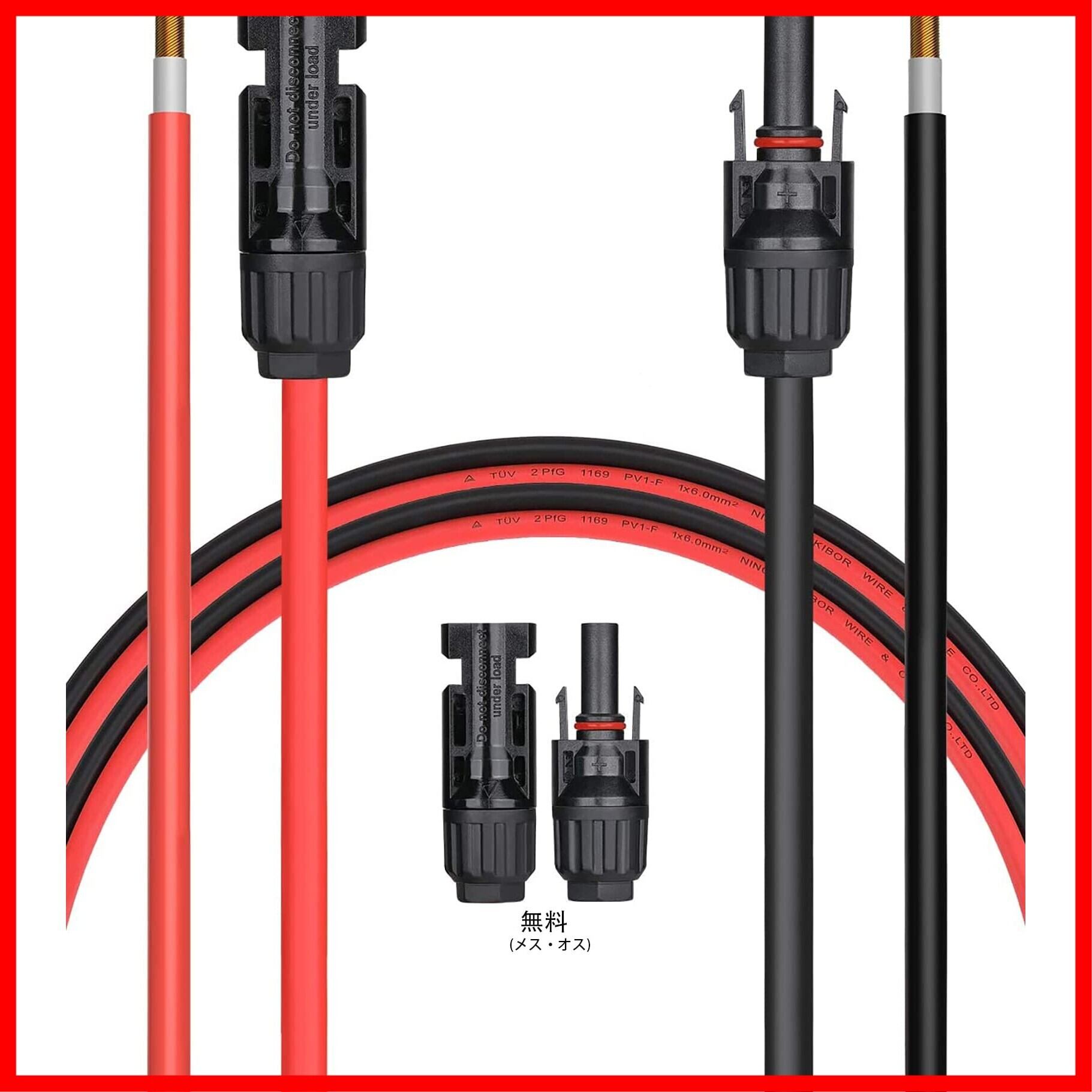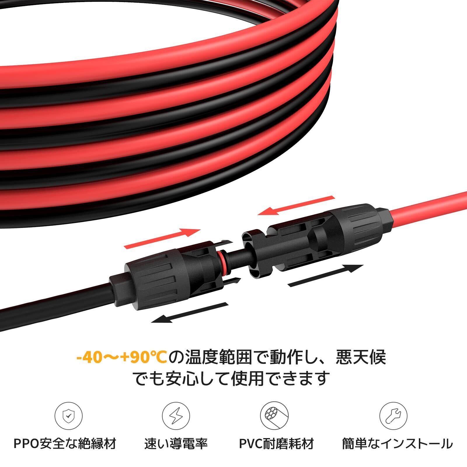 【セット内容】MC4コネクター(オス)付きソーラーケーブル×1本、MC4コネクター(メス)付きソーラーケーブル×1本、MC4コネクター×1セット。ご注意:本ケーブルのMC4コネクターは片端が加工されており、もう片端は装着されていません。