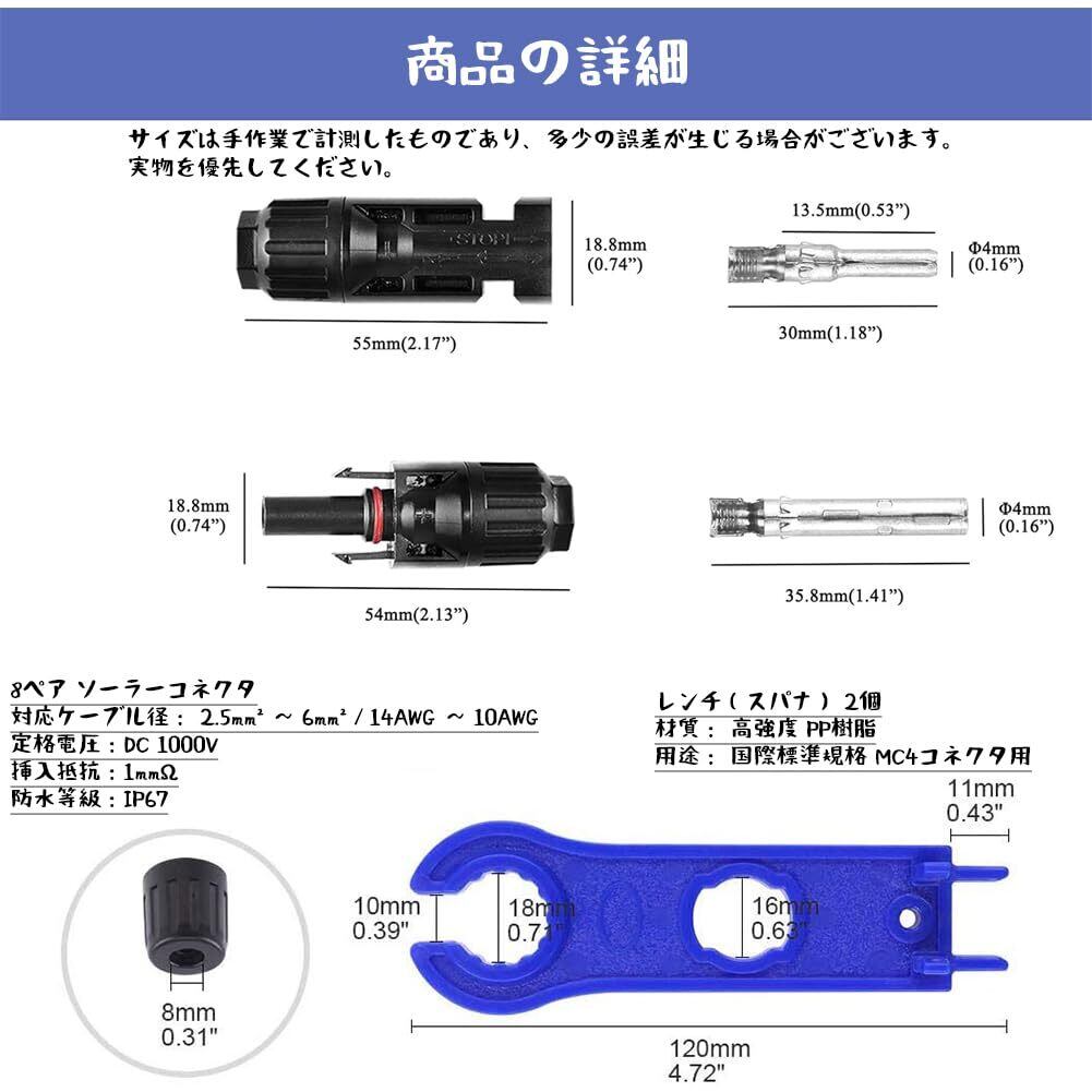 TUDOUZZZ MC4 コネクタ 8組 セット ソーラーパネル 接続ケーブル用(オス・メス) IP67防水 高負荷 高耐熱 MC-4 太陽光発電コネクタ 取り付けレンチ付き2本