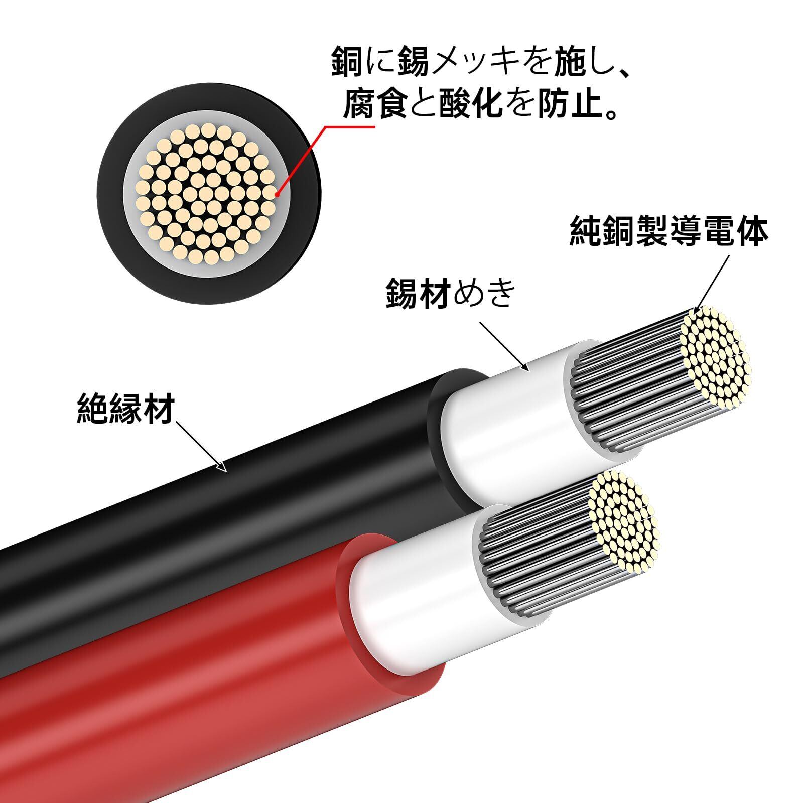 規格:12AWG/サイズ:4mm²/長さ:3m*2本(赤+黒)/IP67防水/、定格電圧:1000V/コネクタのコア:錫メッキ真鍮/国際TUV認証取得/端子タイプ:ソーラーコネクター(両端加工式)