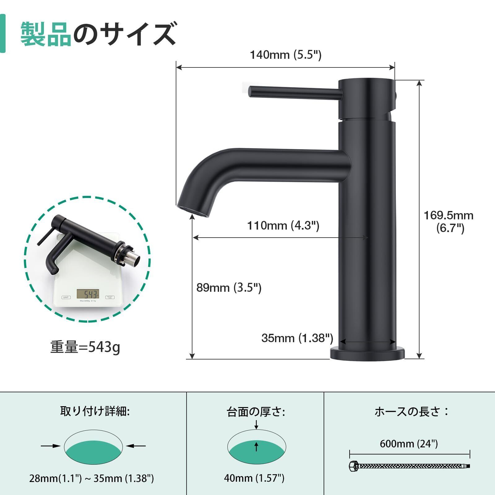 設置サイズ:シングルレバー単水栓高さ:169.5mm。吐水口高さ:89mm。吐水口長さ:110mm。取付穴:28-35mm対応