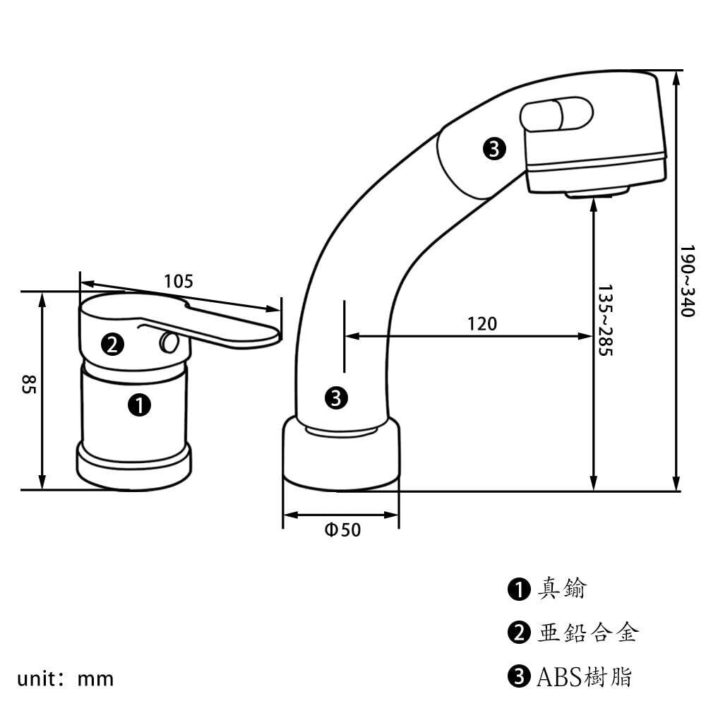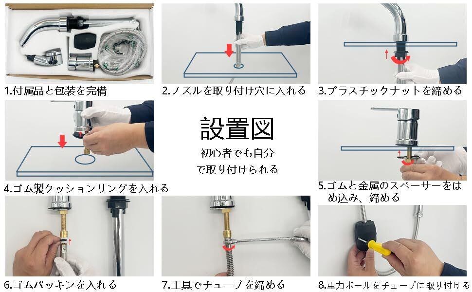 ホース引き出し式、吐水口昇降、360°回転: ホース引き出し最大長さ約55 cm、吐水口昇降最大高さ約14 cm、360°自由に引き出せるノズルは、洗髪にとても便利です