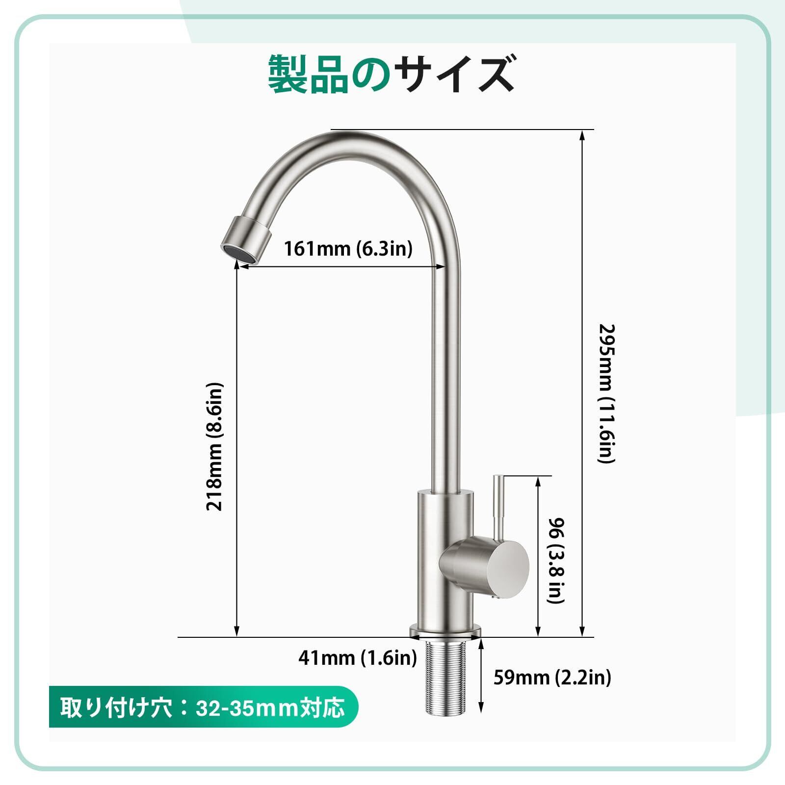 設置サイズ:シングルレバー単水栓高さ:295mm。吐水口高さ:218mm。吐水口長さ:161mm。レバー高さ:96mm。取付穴:32-38mm対応