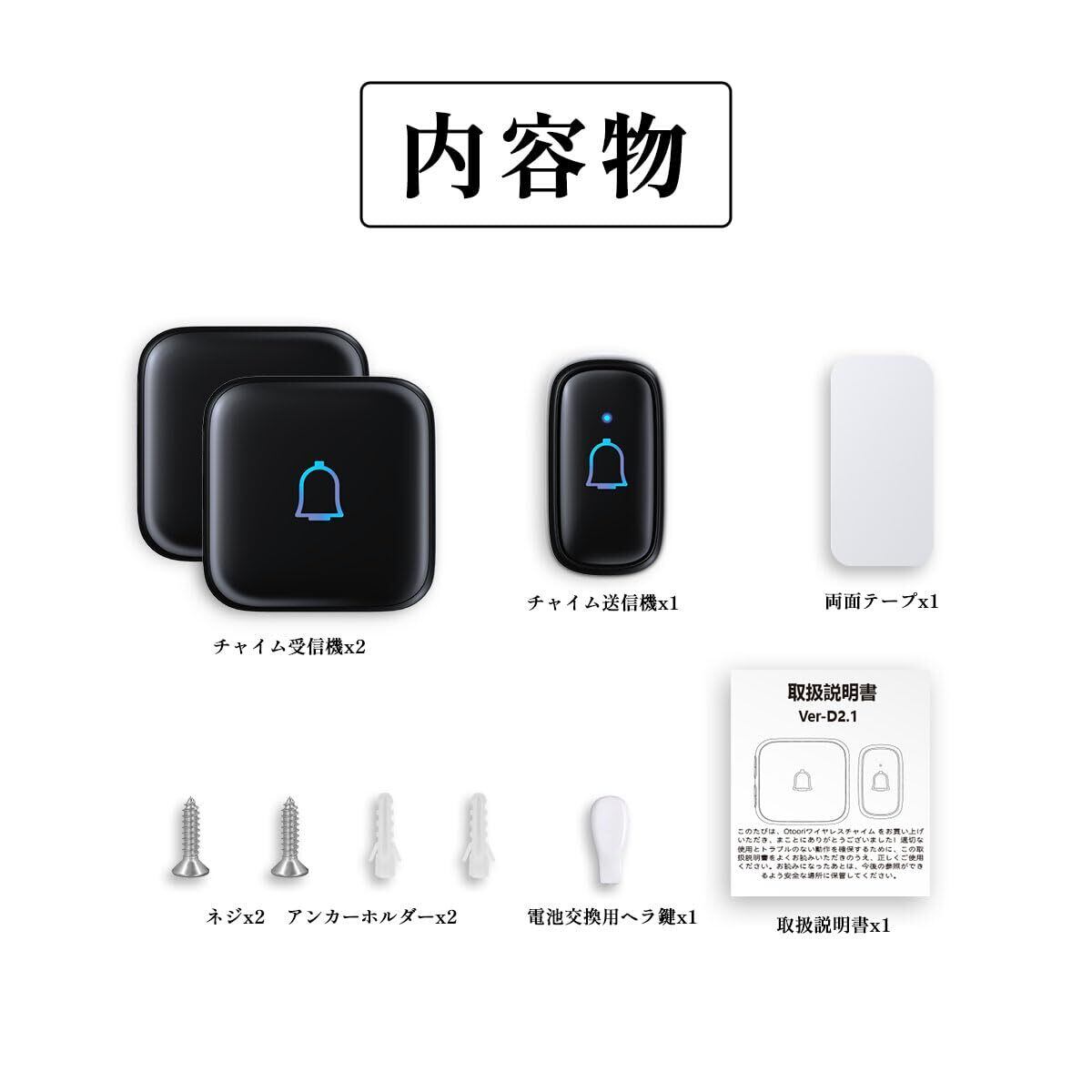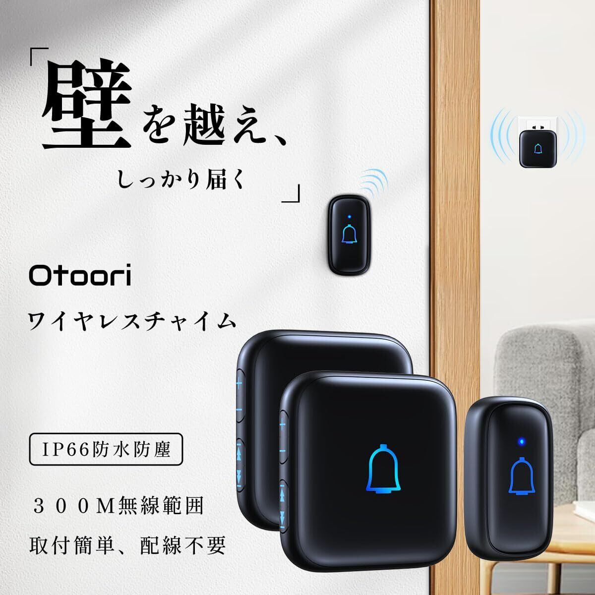 Otoori ワイヤレスチャイム 玄関チャイム IP66防水防塵 送信機電池式 受信機コンセント 115db大音量 300M無線範囲 配線工事不要 取付簡単 7段階音量調節 メモリ機能 60種以上メロディー 音と光で呼び出し LED提示 増設可能 インターホン (1送信機+2受信機)