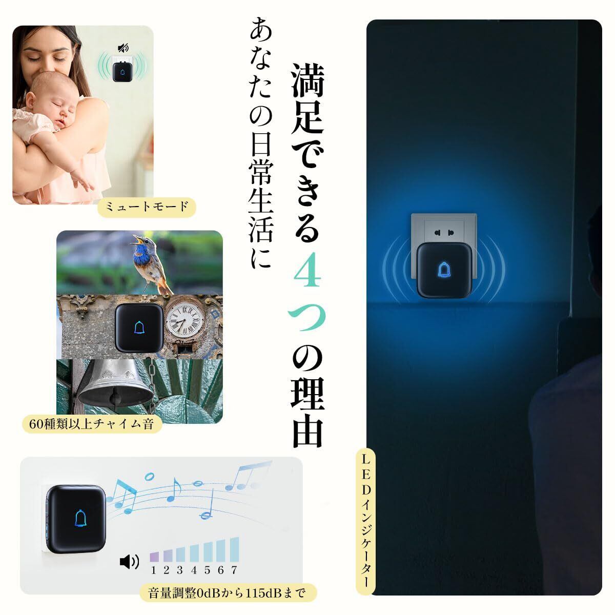 【60種類以上のチャイム音】60種類以上の豊富なチャイム音が選べ、音量も7段階調節可能(0db〜115db)。静かな環境から騒がしい場所まで、どんな状況にも合わせて適切な音量で通知が鳴ります。好みに合わせて音を選び、個性を表現できるので、快適な通知体験を提供します。