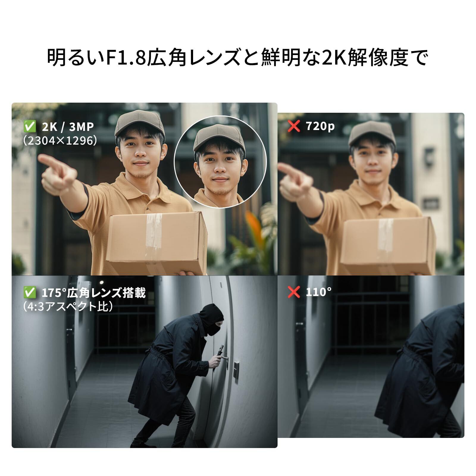 【進化したスマートインターホン】ドアホンG410は、改良された175°の広角レンズと4:3のアスペクト比を採用し、より自然で見やすい映像を提供します。2K高解像度とF1.8の大口径レンズにより、訪問者の顔や周囲の細部まで鮮明に記録可能。さらに、HomeKit、 Alexa、Google Home対応のスマートディスプレイへのリアルタイムストリーミングにも対応しています。