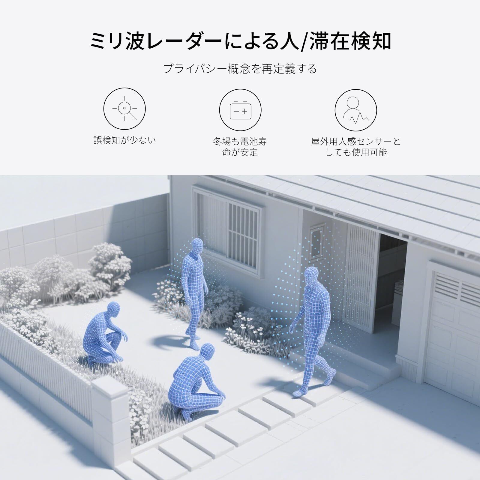 【高精度レーダー検知 & 有線・電池両対応】ミリ波レーダーセンサーを内蔵しており、誤検知が少なく屋外でも高精度な人感・滞在検知が可能。自動化シーンのトリガーとしても活用できます。有線接続とバッテリー駆動の両方に対応し、最大約5ヶ月の電池寿命(1日10回以内の起動を想定)を実現。※使用環境により変動します。人通りの多い場所では省電力モードのご利用を推奨します。
