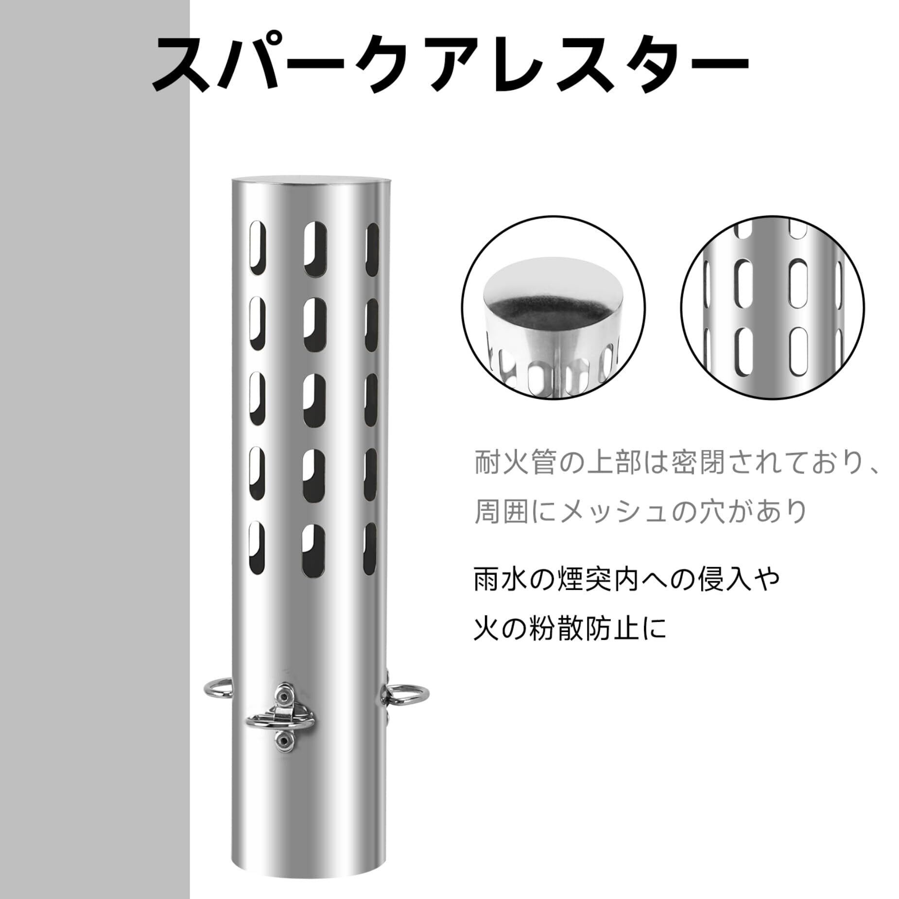 【火の粉対策】煙突の最先端部に装着する事で、網目に阻まれるため、火花の飛散を軽減します。スパークアレスターは火花の一部だけを防ぐことができ、100%の火花ではないことに注意してください。