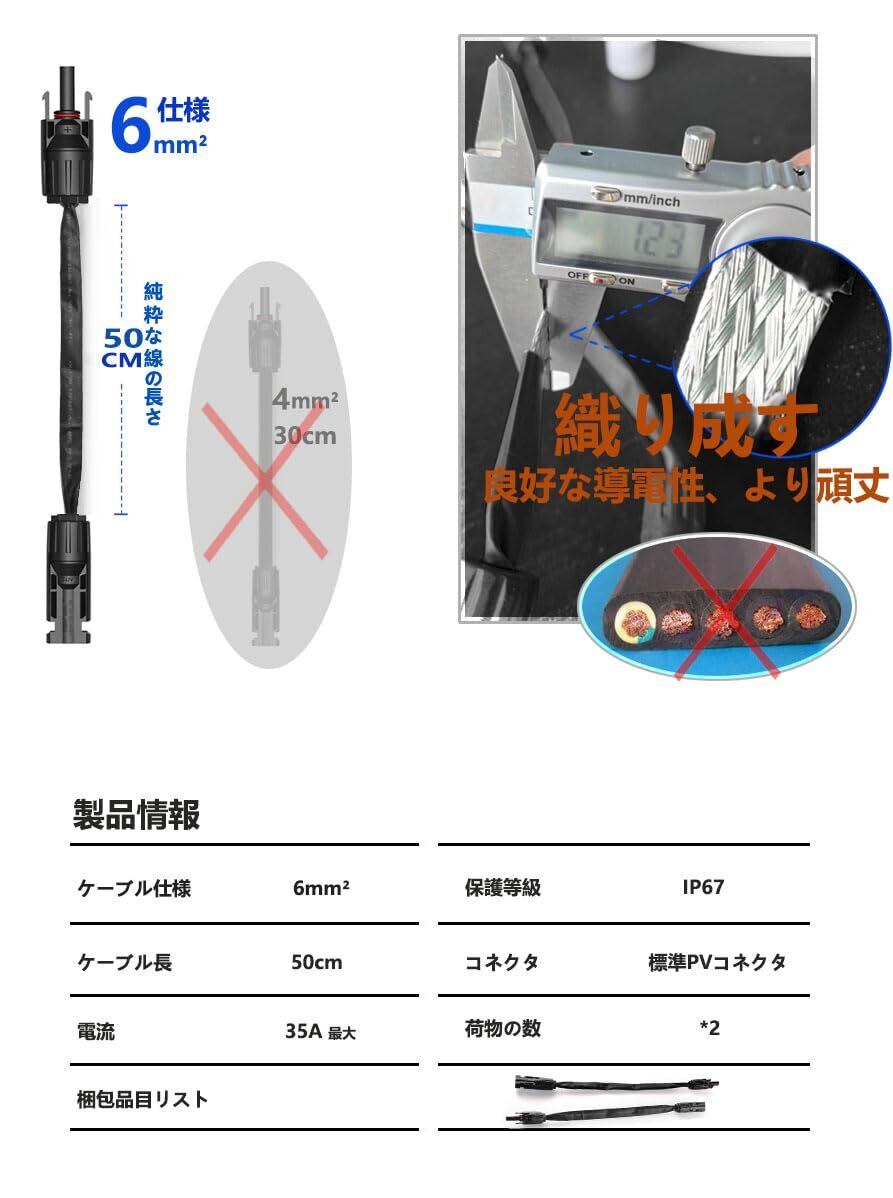 このソーラーパネルケーブル(PVケーブル)は、6mm²で作られており、強い電流と電圧に対応し、800W以上のソーラーパネルを接続することができます。一時的または長期的な使用オプション