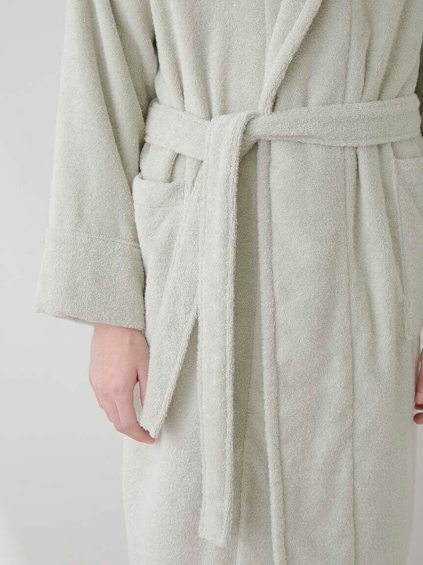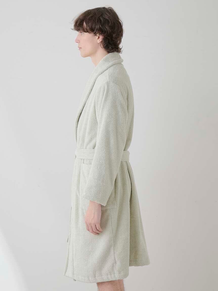 HOMMEでは定番アイテムとなっているパイルガウン。青系をベースとした落ち着いたカラーリングに加え、袖にワンポイントでベアのサガラ刺繍を入れています。ハンガーなどに掛けている際にも絵柄がよく見えるように、サガラ刺繍はあえて前袖部分に入れているのがポイント。色はミントとネイビーの2色をご用意しました。ギフトにもおすすめです。