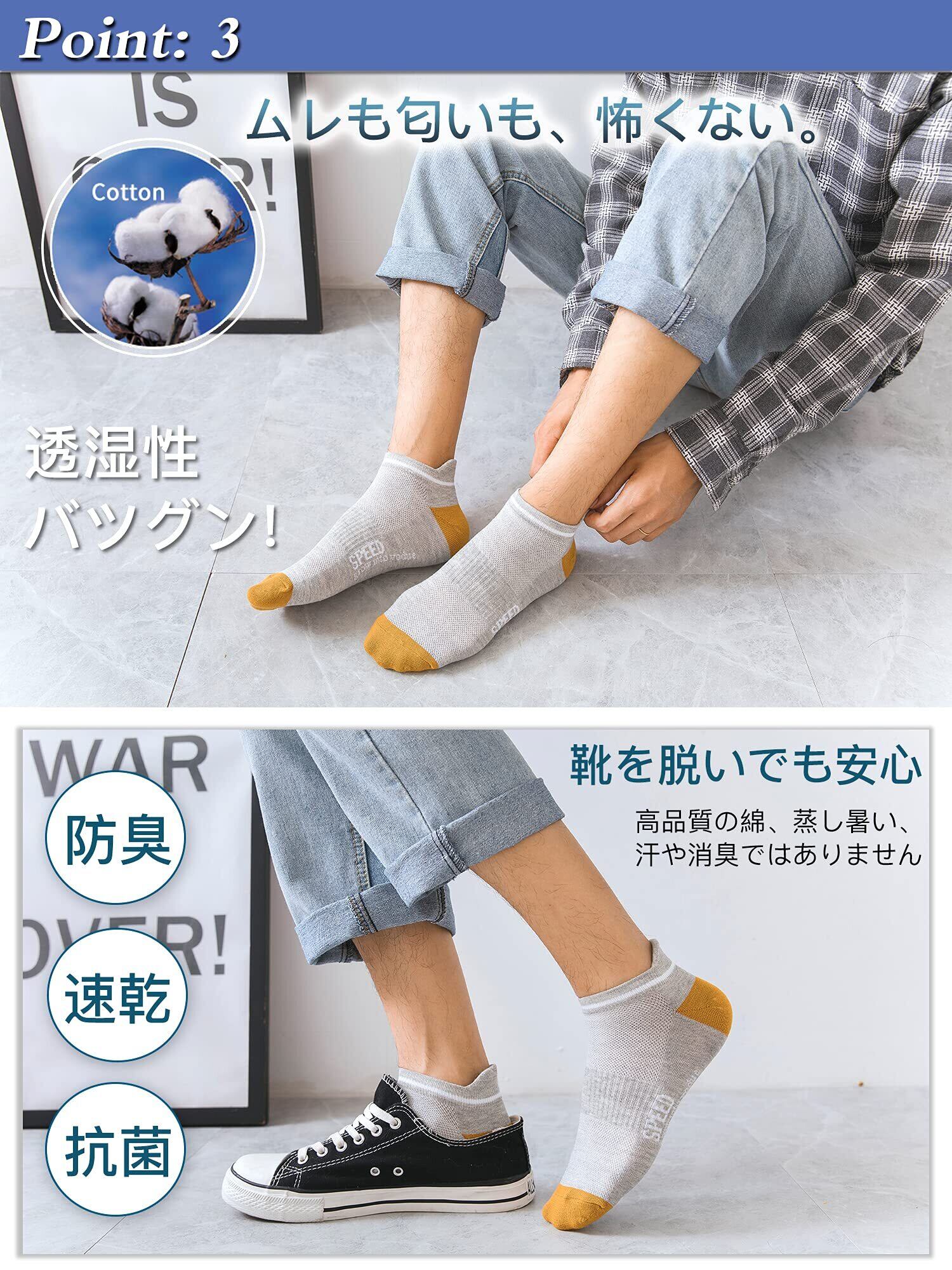 【 防臭・吸汗・速乾】綿素材のため、速乾性や防臭に優れていながらしっかりとした着用感を体感出来ます。蒸れやすい夏場でも、素早く汗を吸収して、外部に放出することで、足を快適でドライな状態に保ってくれます