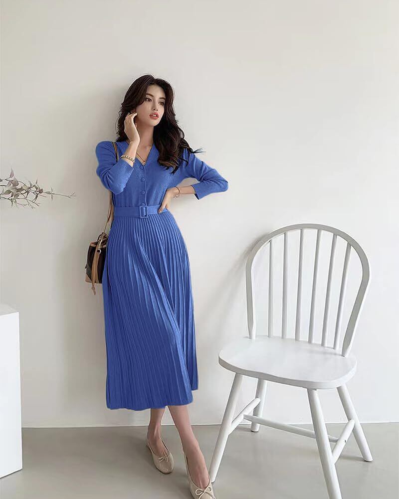 【数量限定】[Collecala] ニットワンピース レディース秋冬きれいめ 上品ワンピース プリーツ模様 ウエストマーク ベルト付き ハイウエスト Aライン Vネック ニット ミモレ丈 着痩せセーターワンピース | Cherry Blossoms