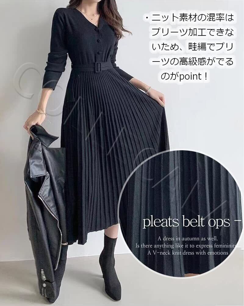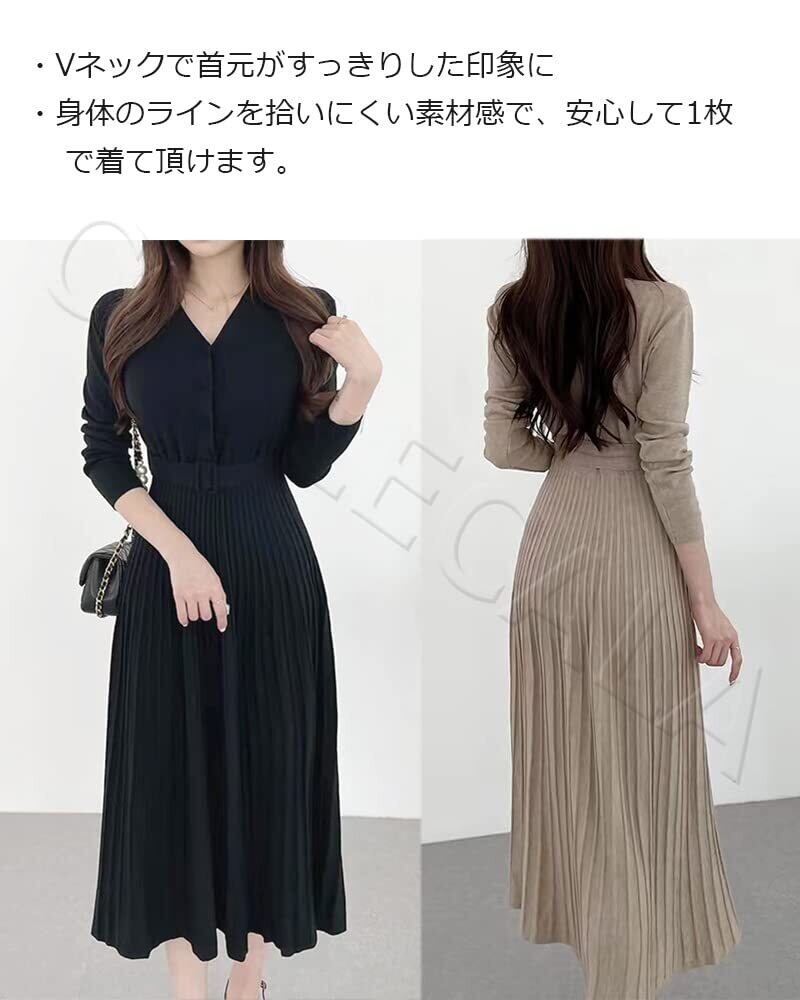 [Collecala] ニットワンピース レディース秋冬きれいめ 上品ワンピース プリーツ模様 ウエストマーク ベルト付き ハイウエスト Aライン Vネック ニット ミモレ丈 着痩せセーターワンピース