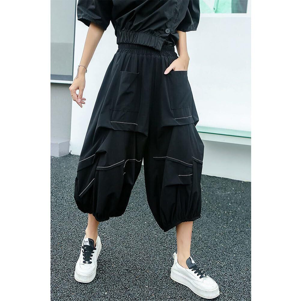 [モリノー] 裾ゴム入り ワイドパンツ 七分丈 サルエル ウエストゴム ポケット付き レディース メンズ ゆったり 薄手 クロップトパンツ モード系 ストリート 夏