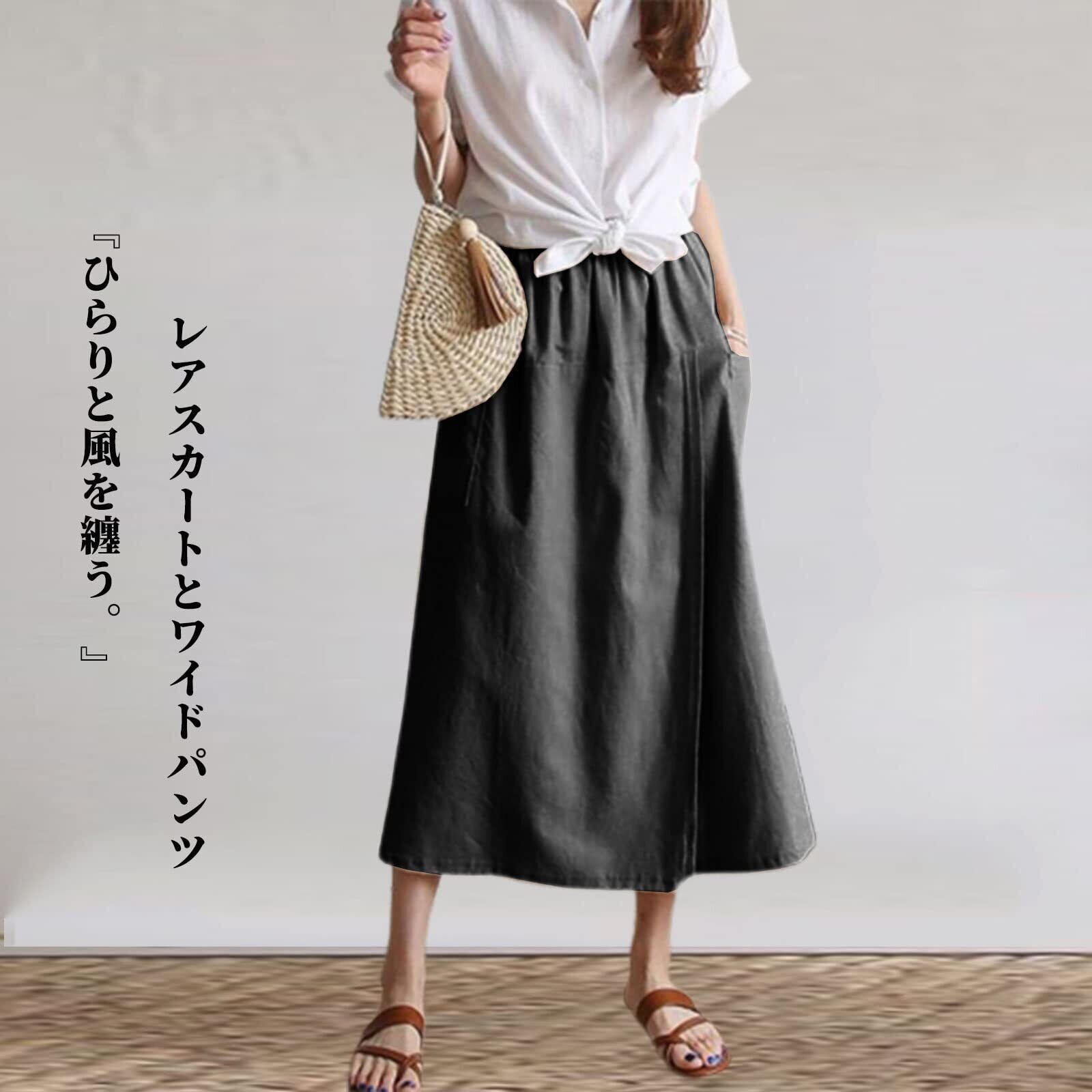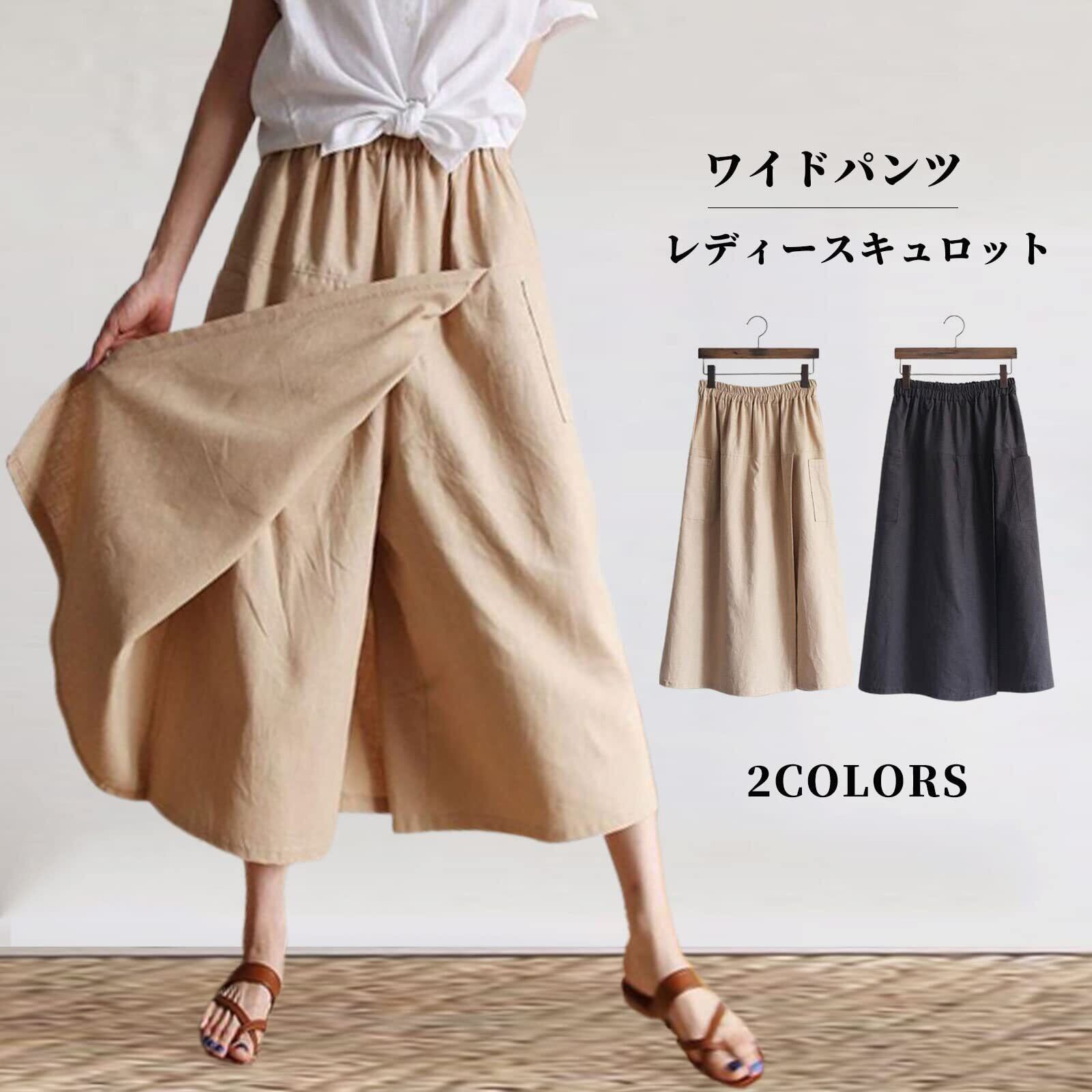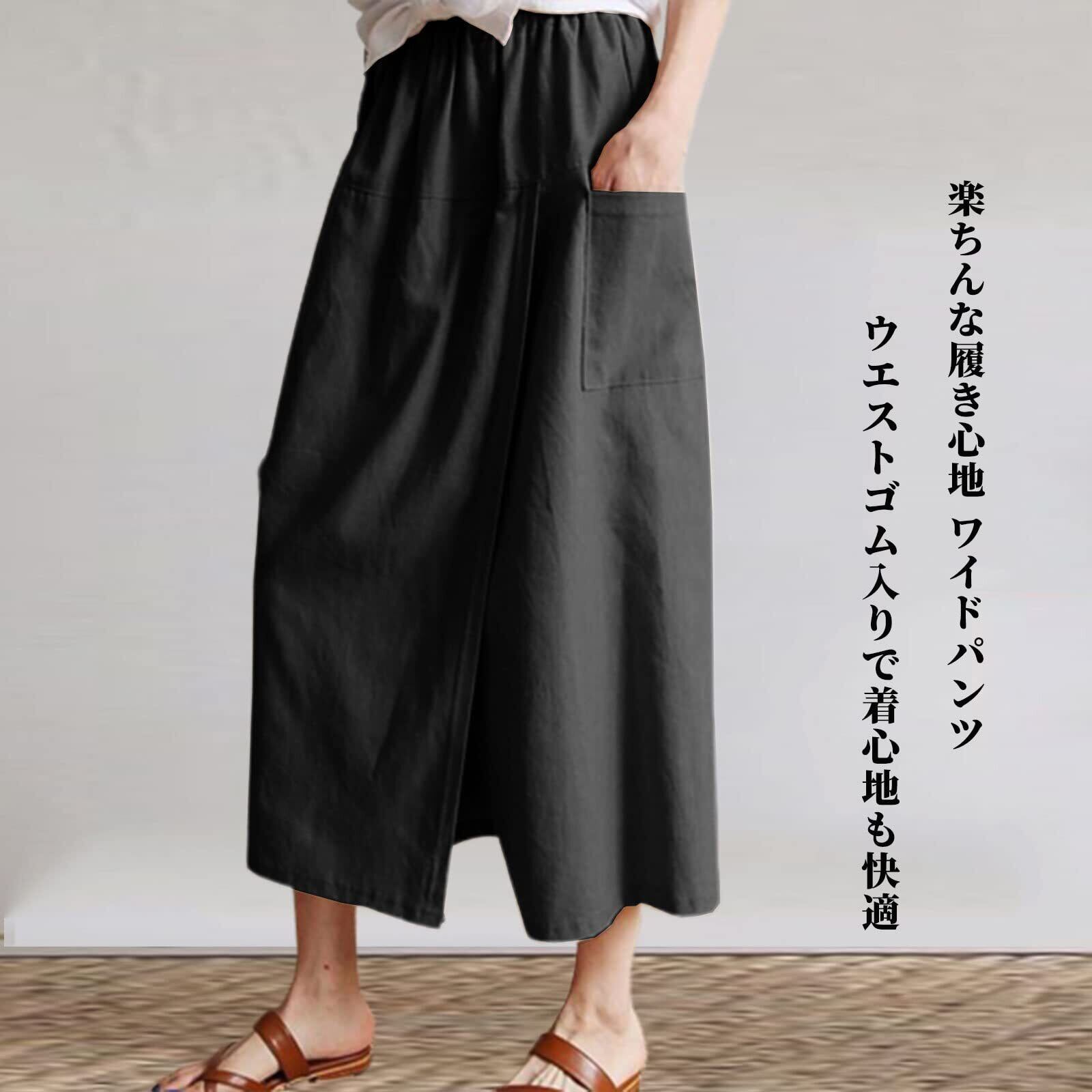 ワイドパンツ レディース ガウチョパンツ キュロット ズボン 袴パンツ ボトムス 綿麻 ウエストゴム ポケット付き 無地 大きいサイズ オフィス 春 夏 秋