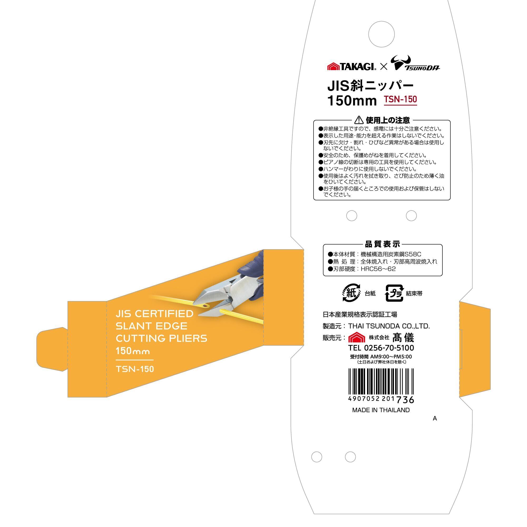 高儀(Takagi) TAKAGI ×TSUNODA JIS 斜ニッパー 150mm TSNー150 電気工事 配線加工 機械修理 作業工具 切る 切断 カッティング プライヤー JIS認定