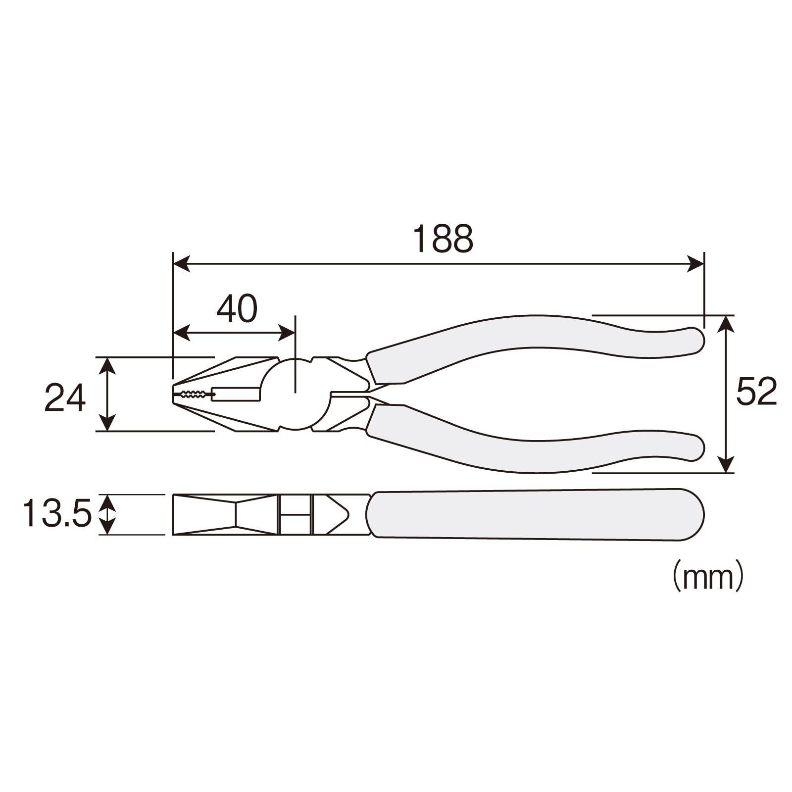 【切断能力】銅線:3.5mmφ、銅より線:5.5mm^2、VVF線:1.6mmφ×3芯【硬度HRC】刃部:60【重量】288g【全長】188mm【用途】電線の曲げ・切断、電気工事、電子機器や精密機械の組み立て・修理、電子工作、プラモデル・模型・アクセサリーの製作、ワイヤーワーク、釣り針の製作や修理