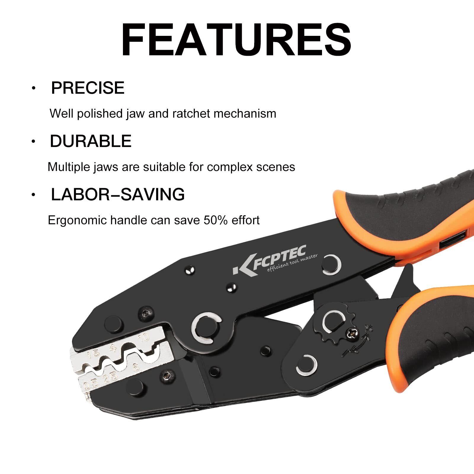 簡単な操作 - 内蔵のラチェットメカニズムと安全リリースにより、圧着が簡単になります。また、圧着の高さを調節することで最適な結果が得られます。 人間工学に基づいたハンドルデザイン、ノンスリップナイロン製、手の疲労を50%軽減し、効率を向上させます。