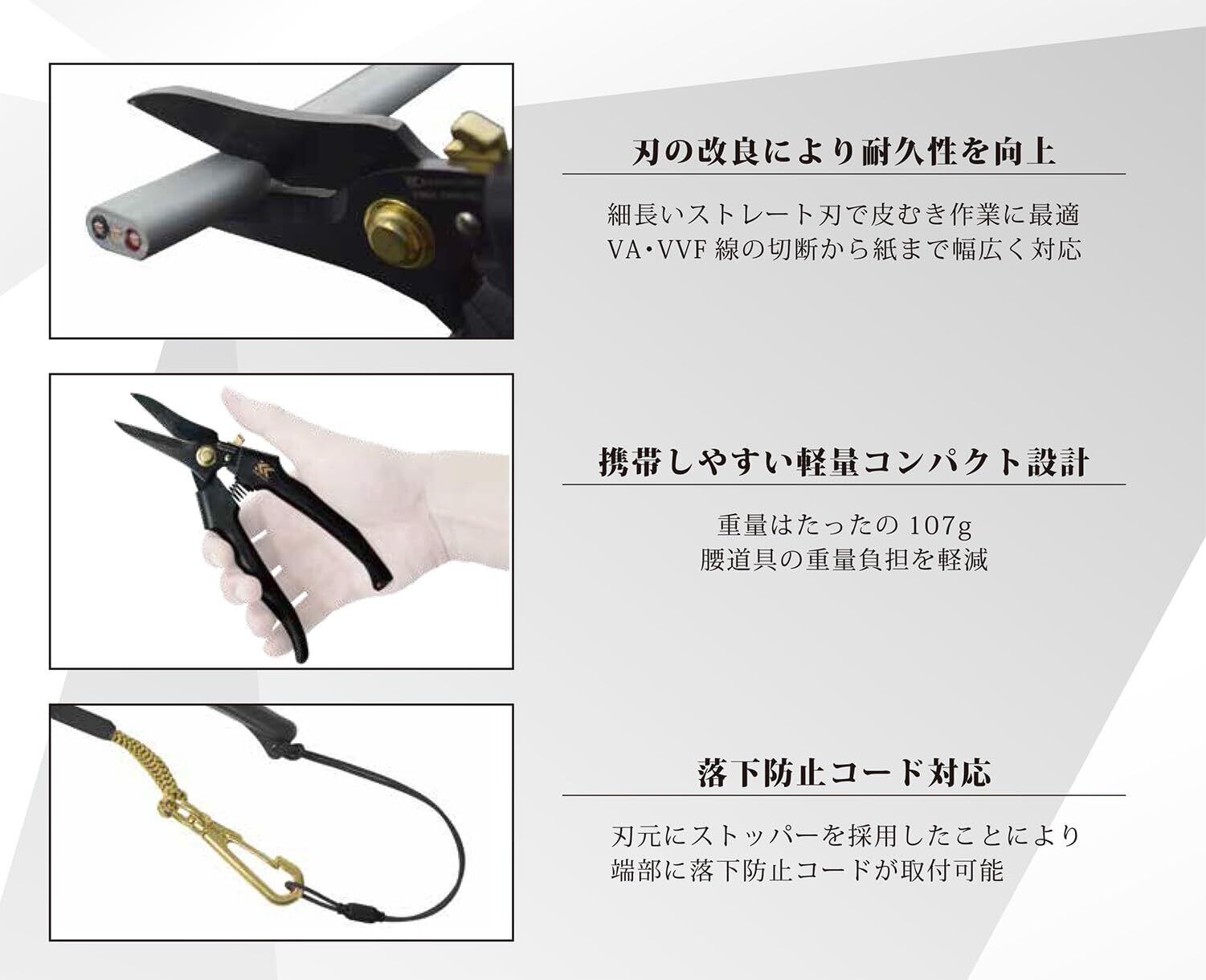 ・VA・VVF線から紙まで幅広く切断可能で、皮むき作業に適した細長いストレート刃で、作業性の良いバネ付タイプ