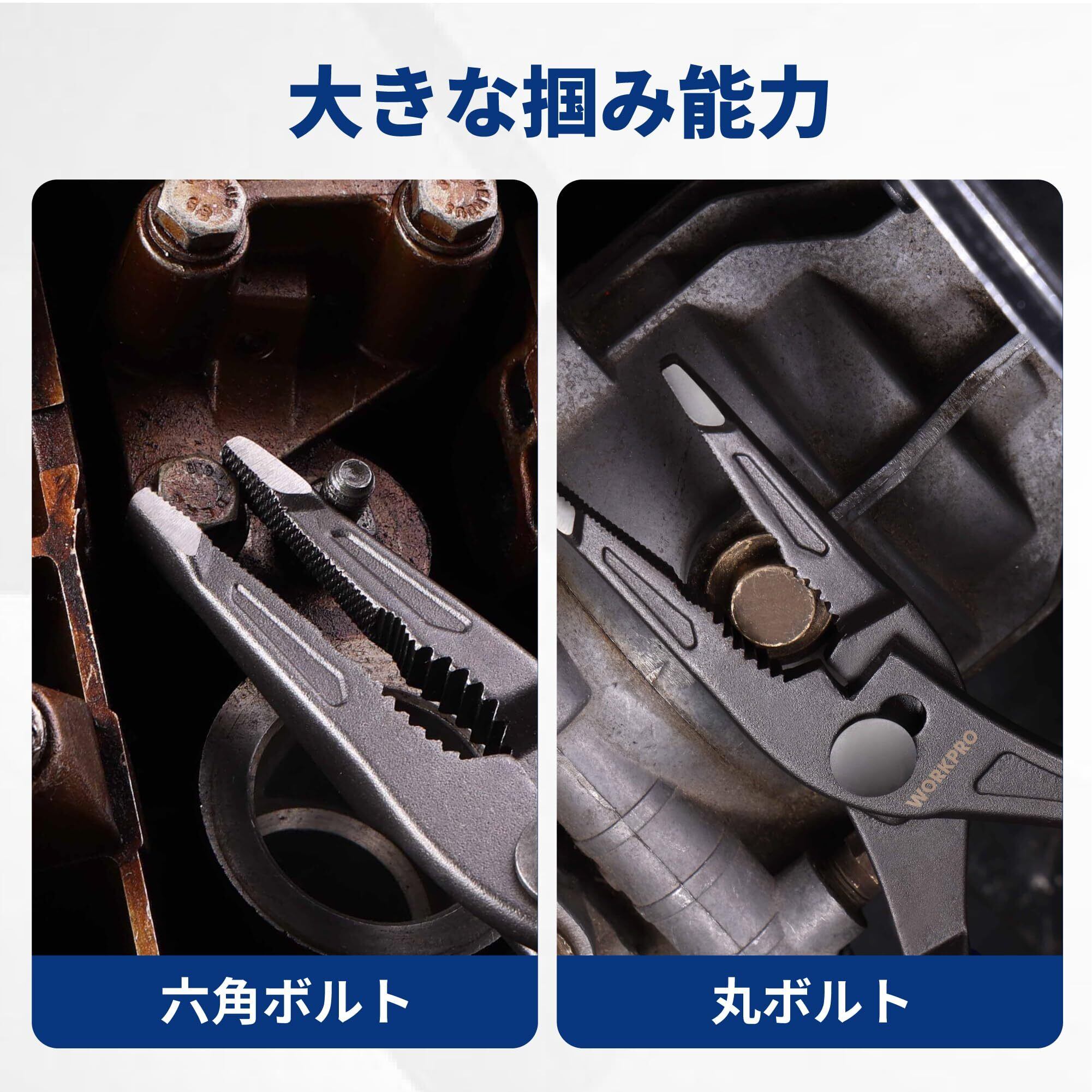 【2段階調節可能なあご部分】あごの開口幅は2段階で調整可能で、さまざまなサイズの対象物をしっかり掴んだり回したりするのに役立ちます。レンチの代わりとして小さなナットやボルトの回転にも適しています。