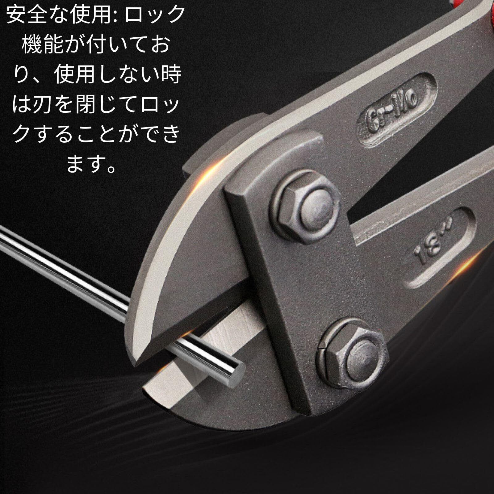 多目的に使用可能: このボルトカッターは工場や工事現場での作業用に最適ですが、日常生活でも様々な場面で活躍します。例えば、自転車の鎖の切断や金属板のカットなど、さまざまな用途に対応しています。サイズ(約):22 x 12cm