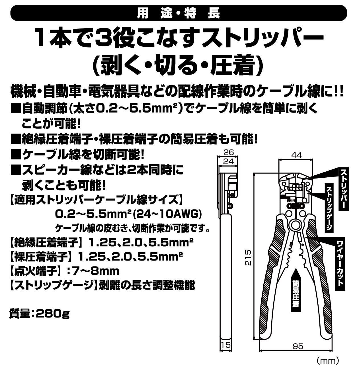 ケーブルの皮むき適応範囲:AWG24~10(0.2~5.5sq)