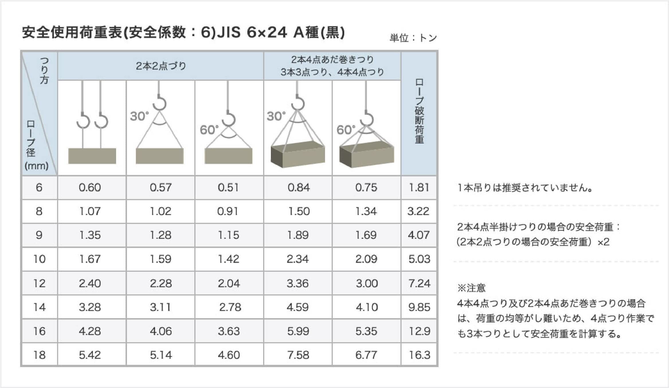 加工部にロープ径の 20 倍以下での曲げ使用厳禁。1本吊厳禁。