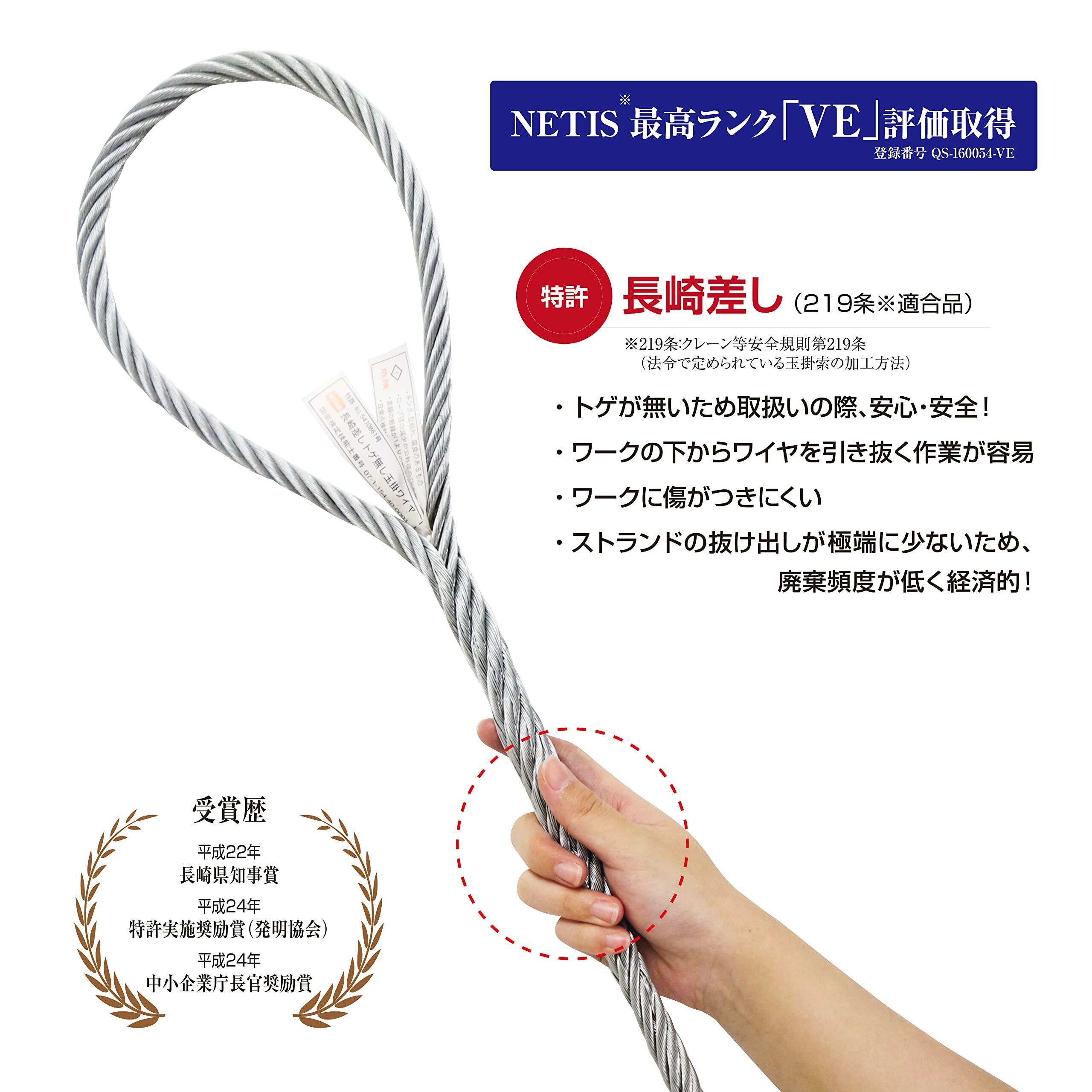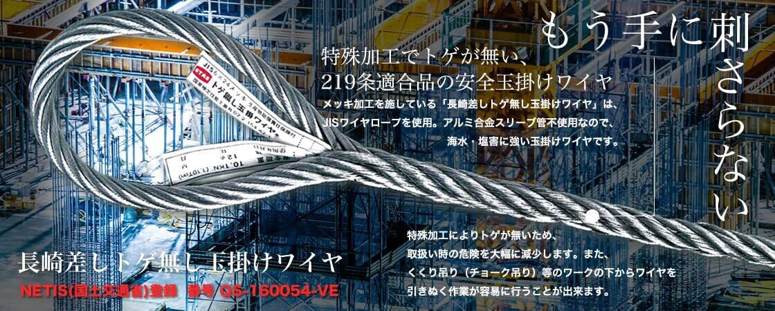 特許【長崎差し】により、トゲが無いため取り扱いの危険度が減少し吊荷も傷つきにくく、吊荷の下からワイヤを引き抜く作業が容易。ストランド抜け出しが少なく破棄頻度が低い。