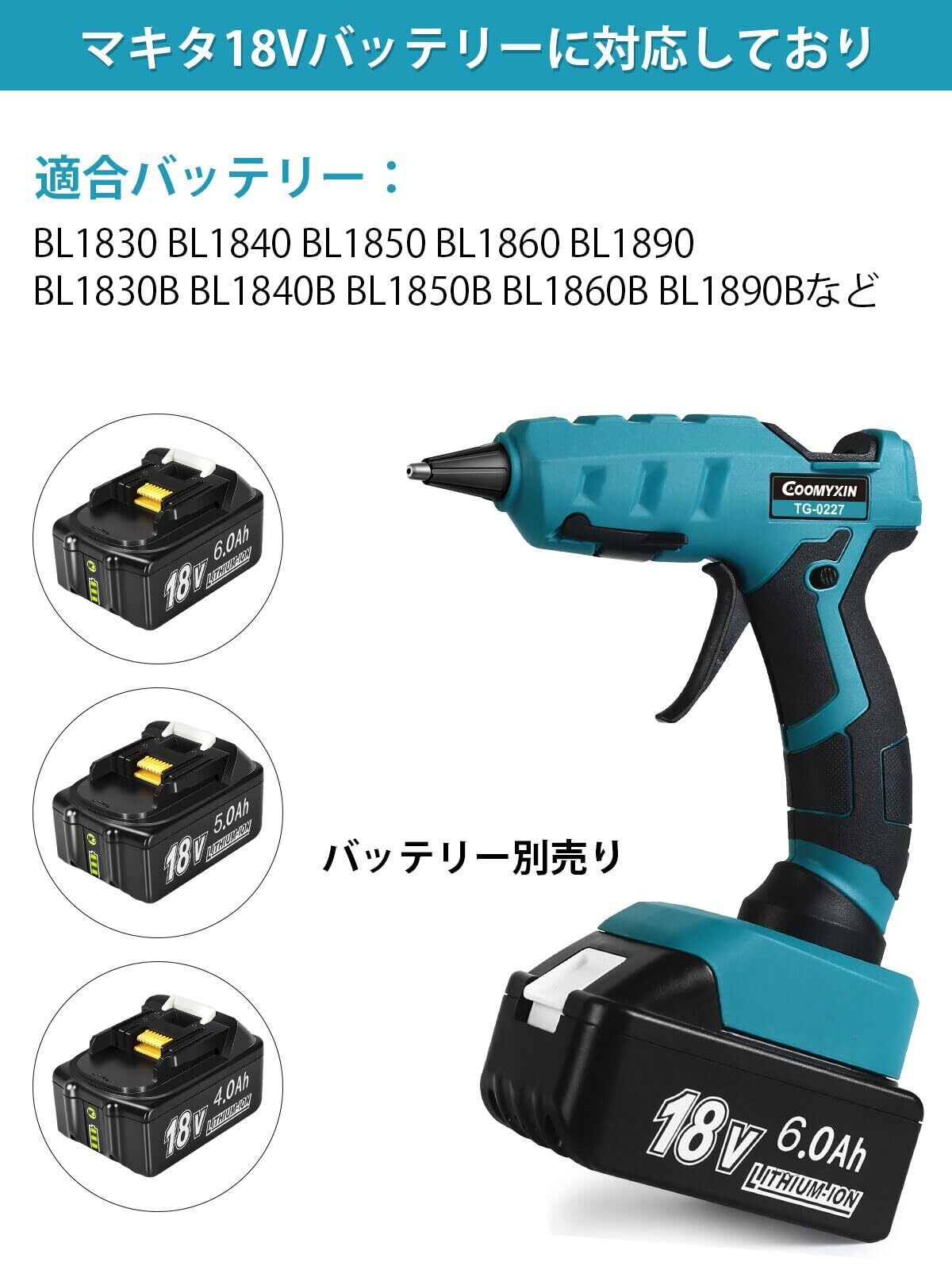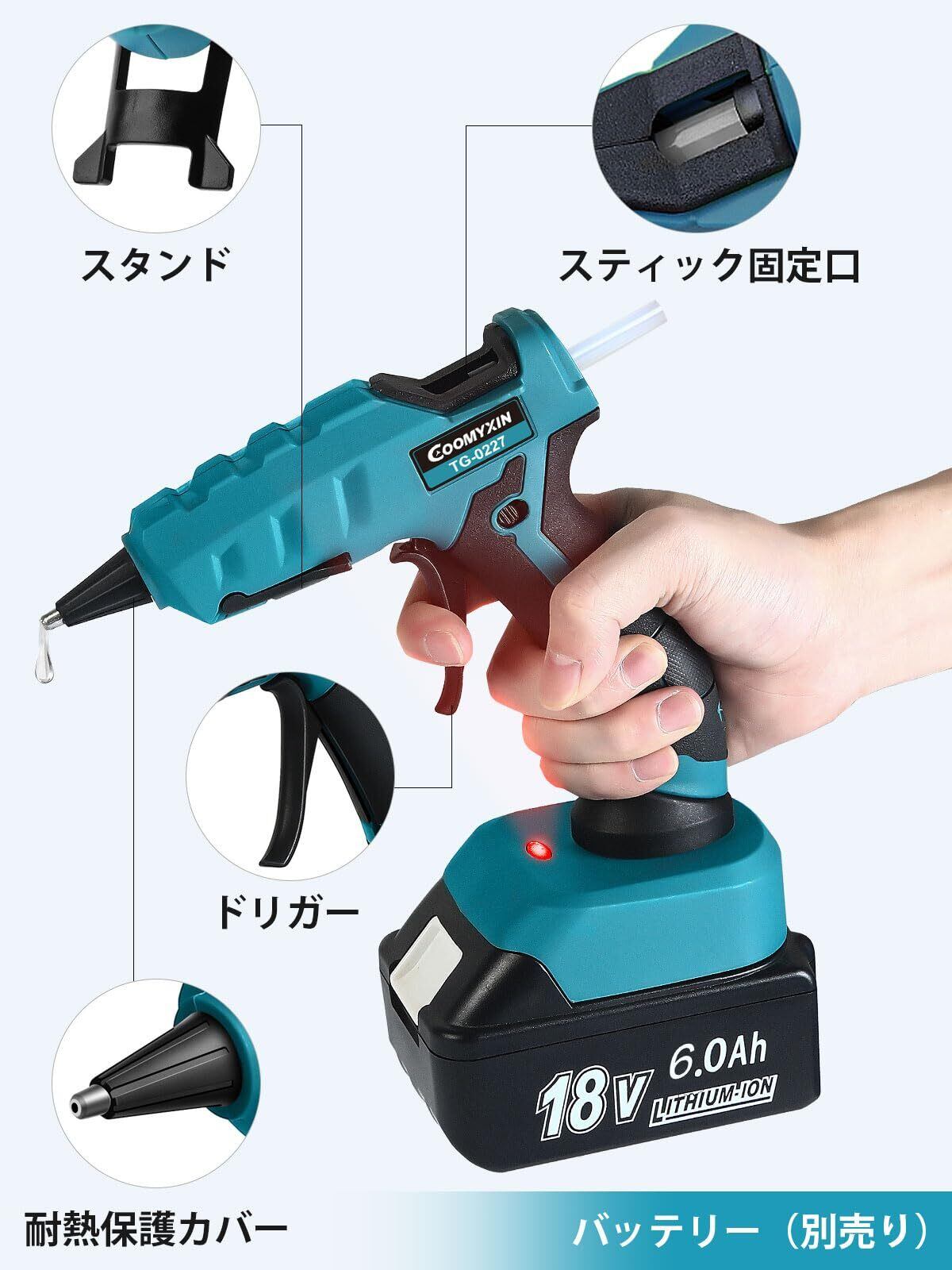 【商品仕様】■型番:TG-0227 ■重量:230g ■サイズ:18×17×7.5cm ■グルー排出量:約3.5g/min ■対応バッテリー:マキタ14.4V&18Vバッテリー ■予熱時間:90s