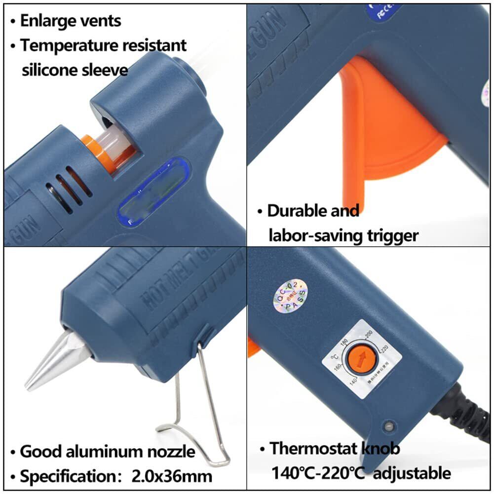 ▲グルーガンには温度調整ノブが付いており、140度〜220度の範囲で調整できます。異なる温度は接着剤の速度を制御することができ、接着剤をより滑らかにします。