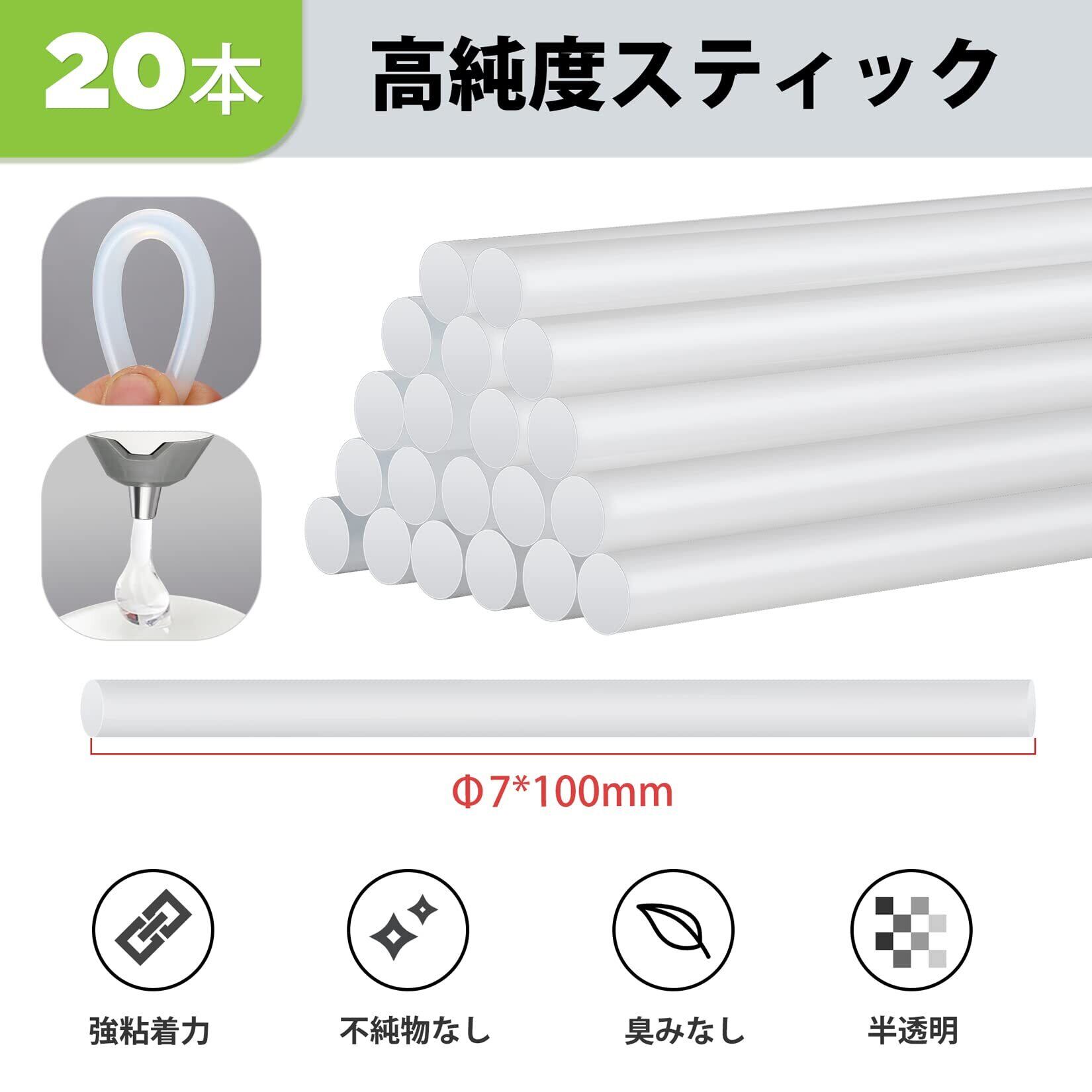【グルーガンスティック 20本付属】20本の専用グルースティックが含まれています。サイズ:φ7x100mm。強力な接着剤のため、粘着力を持ちつつ、環境に優しくて臭みもありません。半透明で目立たなくて金属、木材、布地、プラスチック、セラミックスなど色な素材をくっつけて、様々な接着作業に向いています。