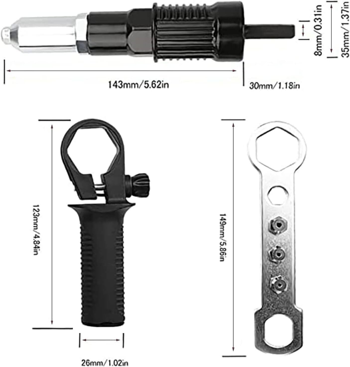 【セット内容】1×リベットガンアダプター、4×ノーズピース、1×万能六角レンチ+六角ハンドル。(合計7点)