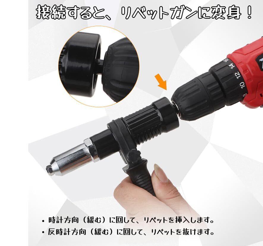 【簡単に使用】 電気・充電式インパクトドライバーに装着するだけでリベッターになる。手動よりは楽しい。