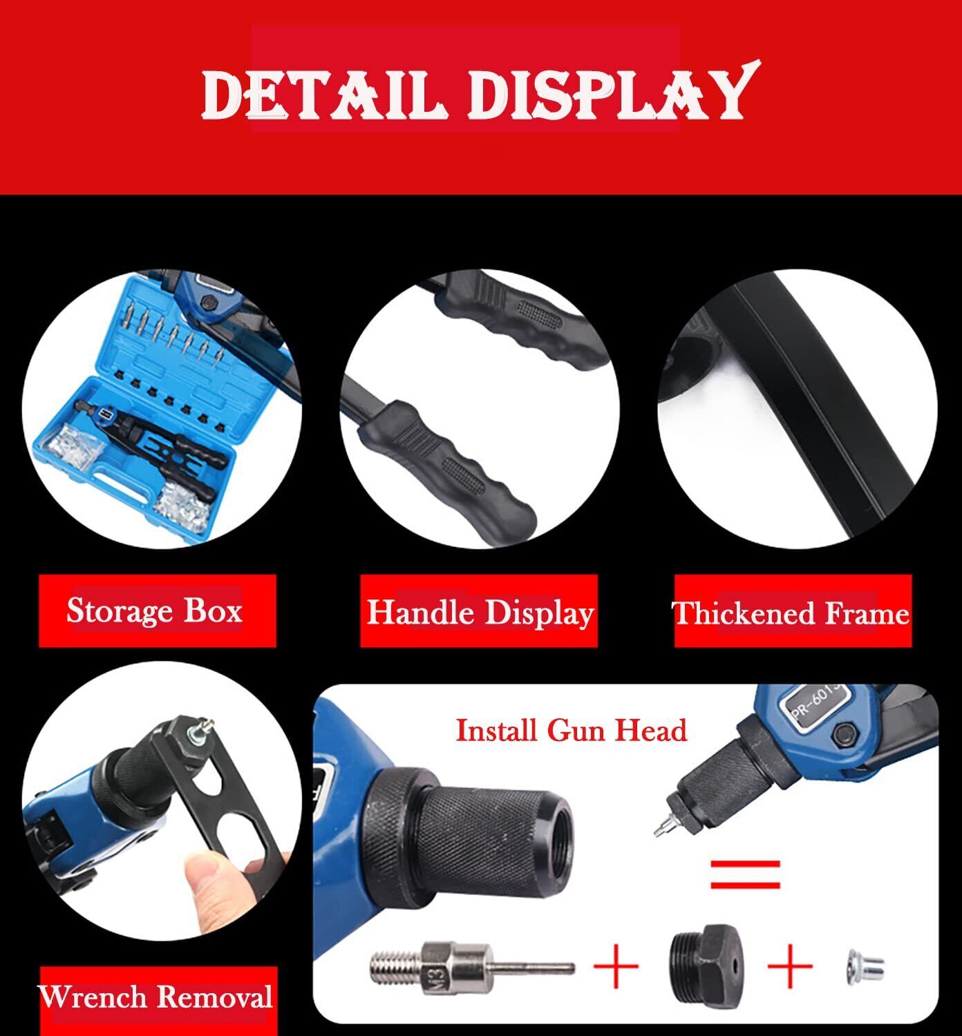 【使いやすい】工具不要のクイックチェンジヘッド設計により、小さなレンチを使ってマンドレルや鼻のピースを手で簡単に交換できます。車両の改造/家具/金属/鉄/プラスチック/プレートのリベット留めに最適です。